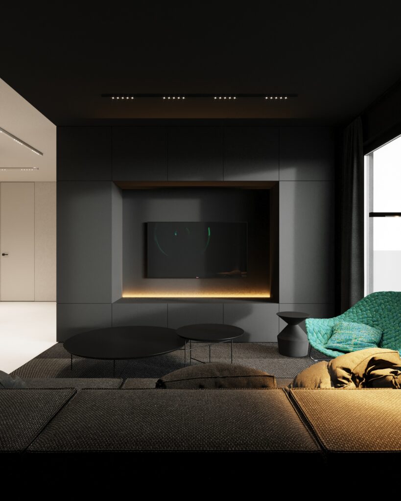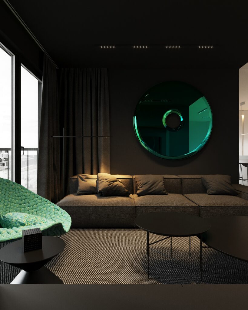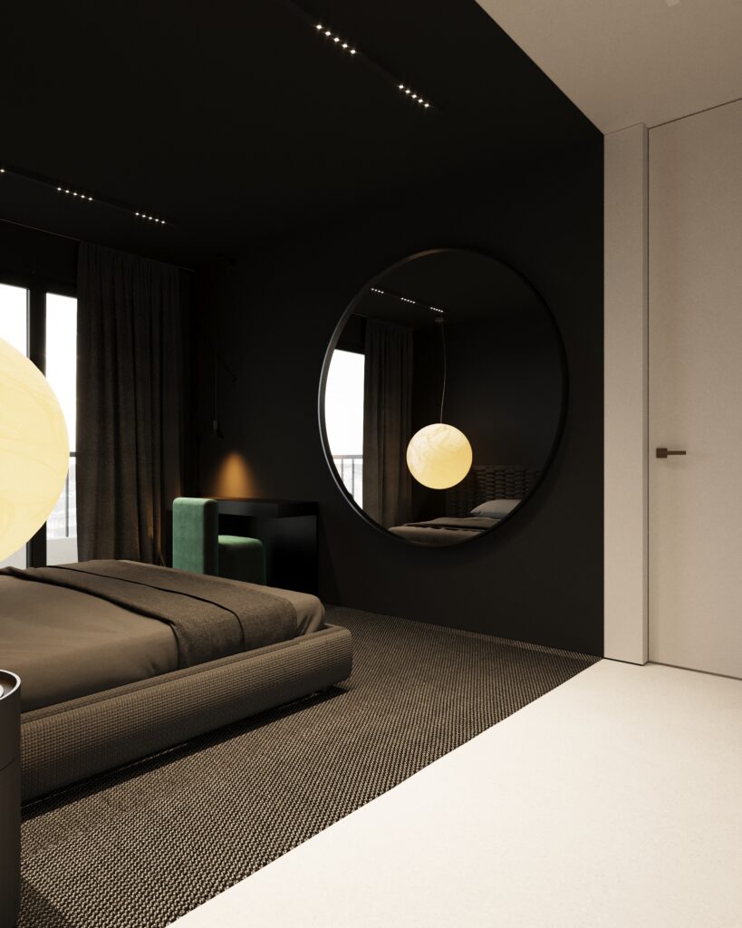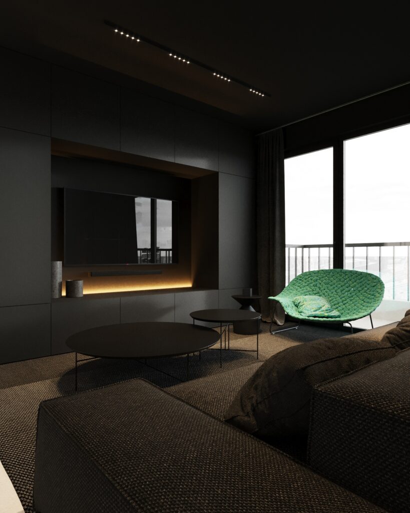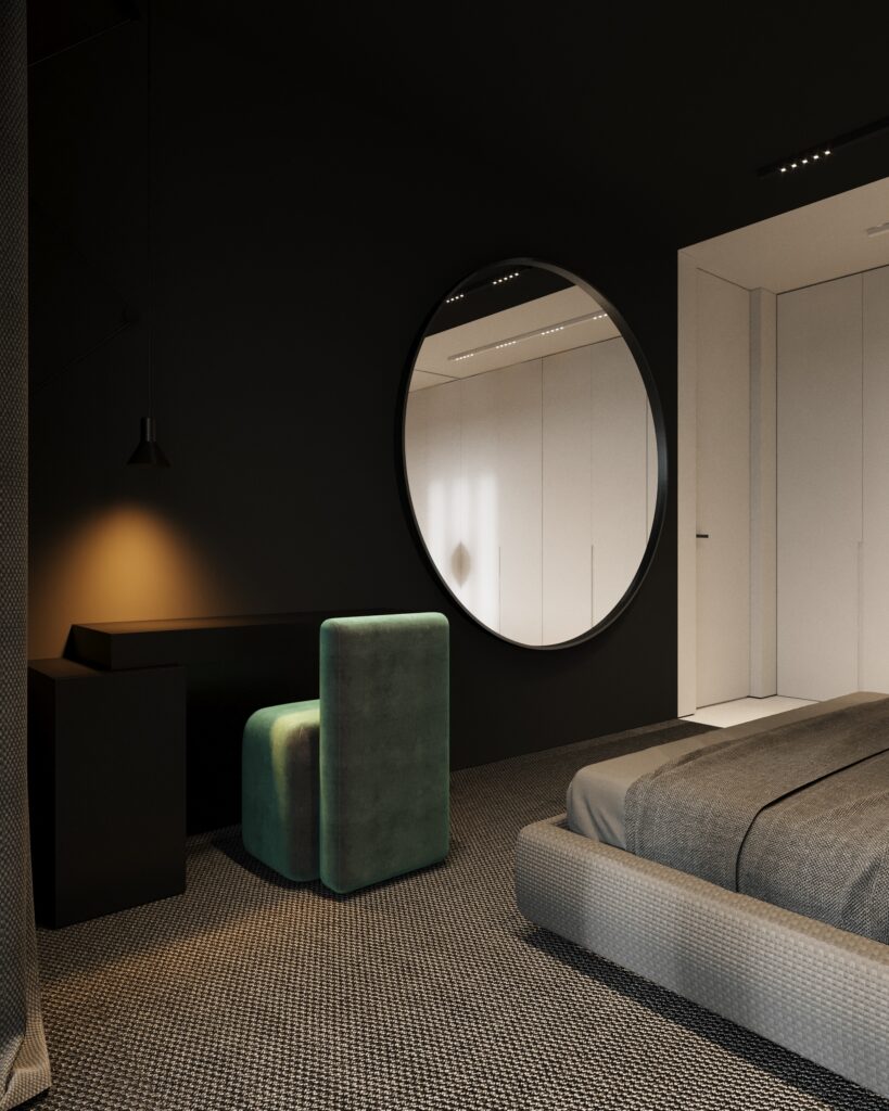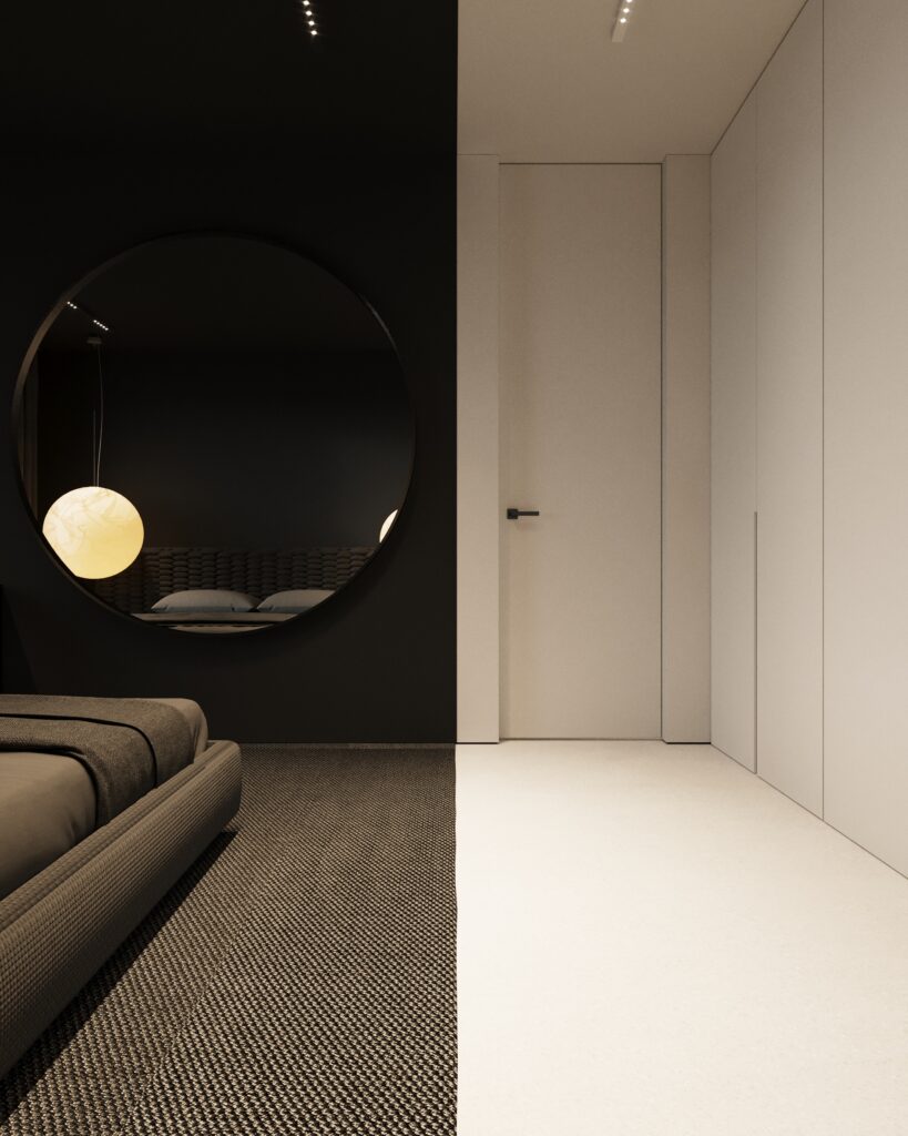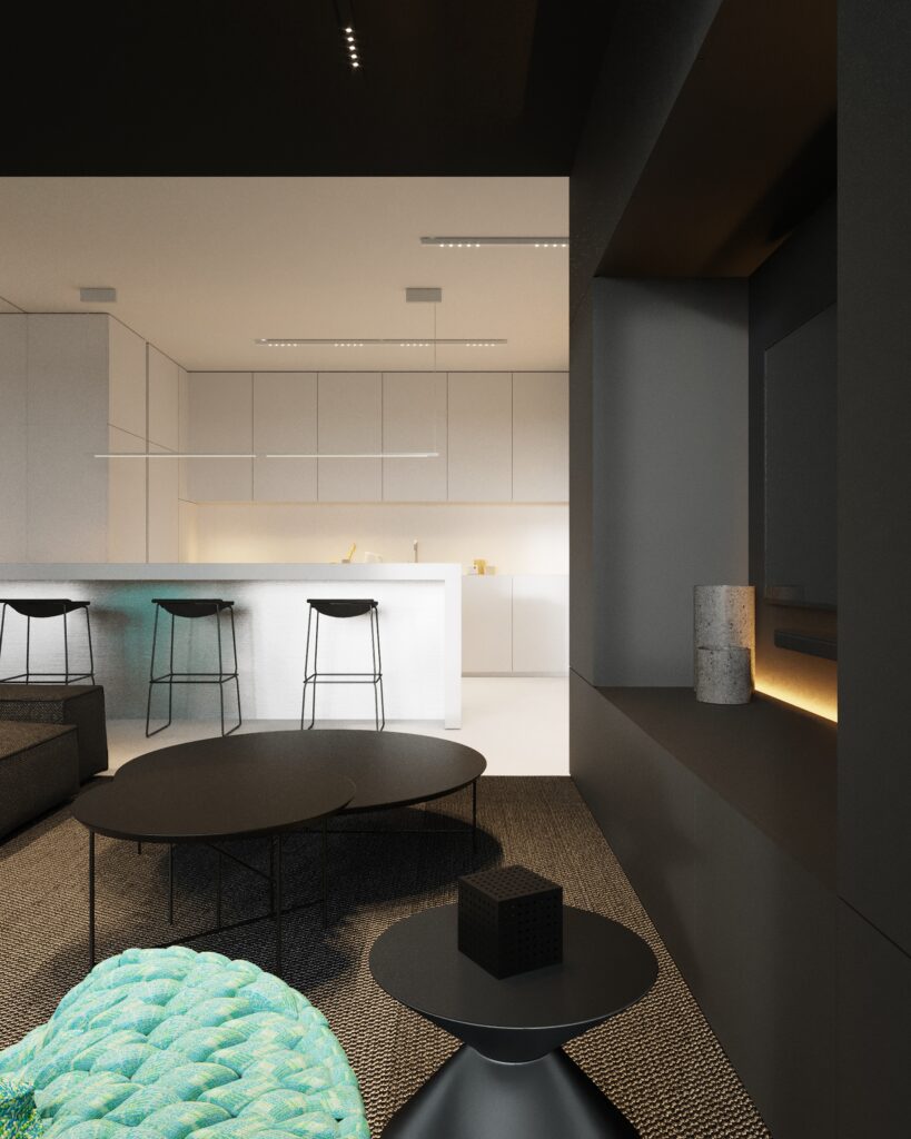 Projekt wnętrza oparty na geometrii, kontraście i świadomej redukcji. Biel i czerń stanowią tu główną oś kompozycyjną. czyste, zdecydowane, niekonkurujące ze sobą nawzajem ani z otoczeniem. Przestrzeń została zaprojektowana tak, by niczego nie udowadniać. Nie walczy kolorem, fakturą ani nadmiarem detalu. Jej siłą jest spokój wynikający z konsekwencji. Geometryczne kształty porządkują wnętrze i nadają mu charakter, a monochromatyczna paleta wprowadza ciszę wizualną. Zieleń, zazwyczaj kojarzona z uspokojeniem w tym projekcie pełni inną rolę. Jest akcentem. Elementem wyrazistym, który ożywia przestrzeń i przełamuje jej ascetyczny charakter. To wnętrze, w którym każdy kolor i linia mają swoje uzasadnienie. Spokojne, precyzyjne, świadome. Projekt, w którym forma nie dominuje tylko współistnieje z funkcją.