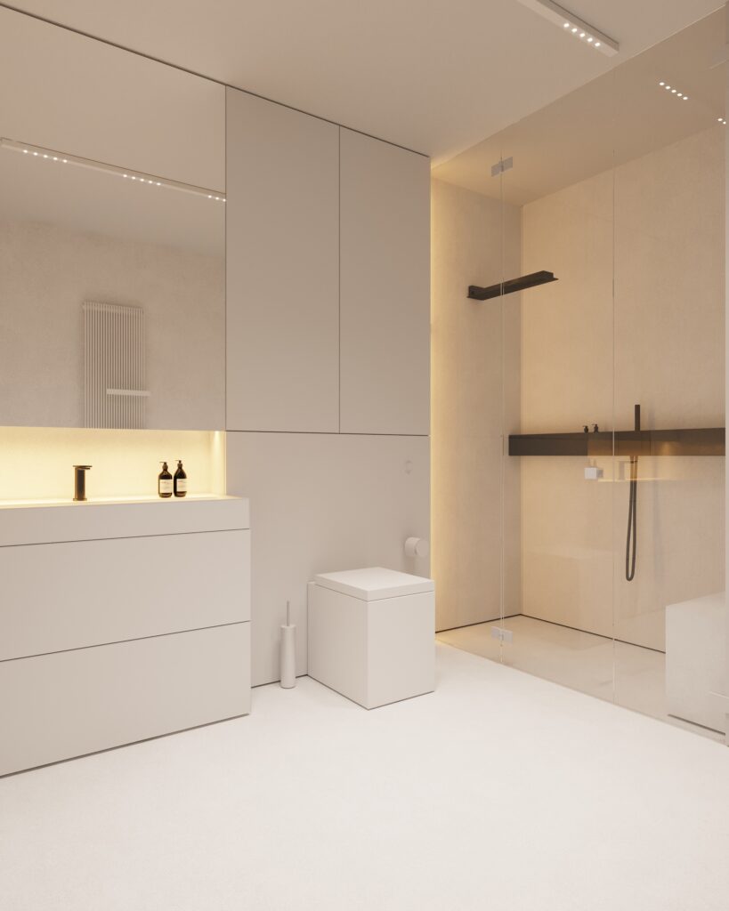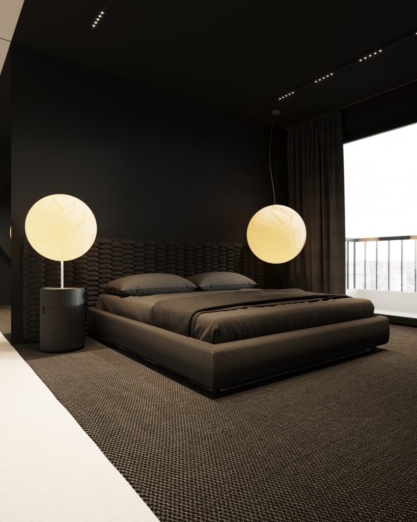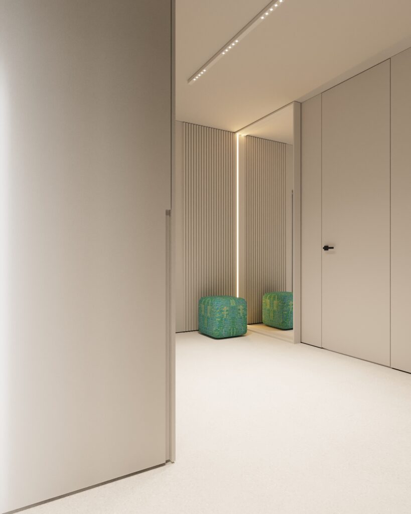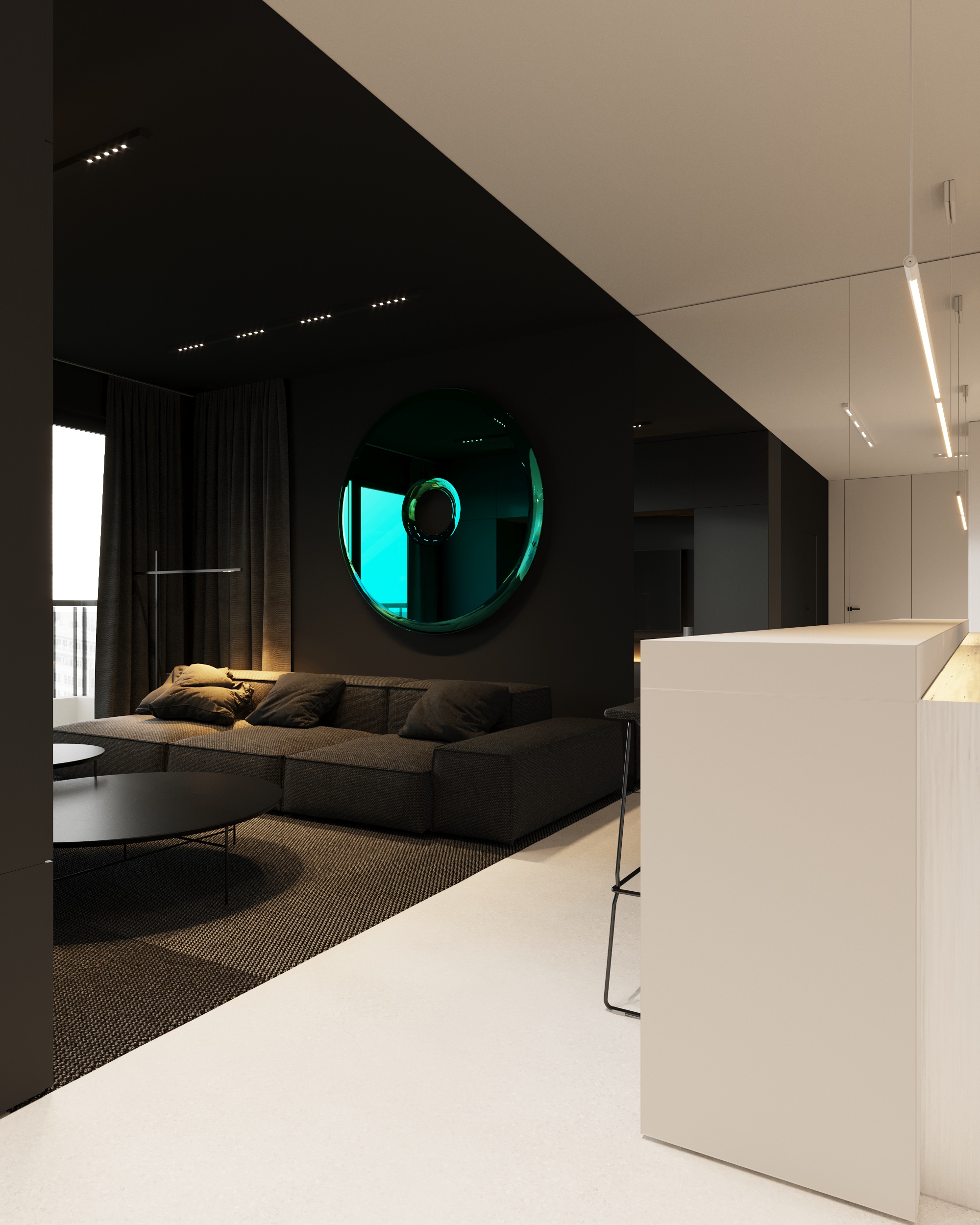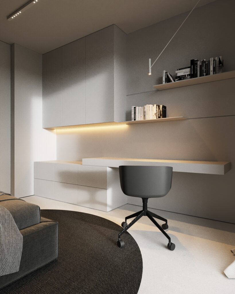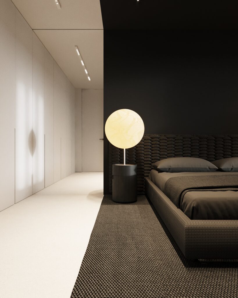 Projekt wnętrza oparty na geometrii, kontraście i świadomej redukcji. Biel i czerń stanowią tu główną oś kompozycyjną. czyste, zdecydowane, niekonkurujące ze sobą nawzajem ani z otoczeniem. Przestrzeń została zaprojektowana tak, by niczego nie udowadniać. Nie walczy kolorem, fakturą ani nadmiarem detalu. Jej siłą jest spokój wynikający z konsekwencji. Geometryczne kształty porządkują wnętrze i nadają mu charakter, a monochromatyczna paleta wprowadza ciszę wizualną. Zieleń, zazwyczaj kojarzona z uspokojeniem w tym projekcie pełni inną rolę. Jest akcentem. Elementem wyrazistym, który ożywia przestrzeń i przełamuje jej ascetyczny charakter. To wnętrze, w którym każdy kolor i linia mają swoje uzasadnienie. Spokojne, precyzyjne, świadome. Projekt, w którym forma nie dominuje tylko współistnieje z funkcją.