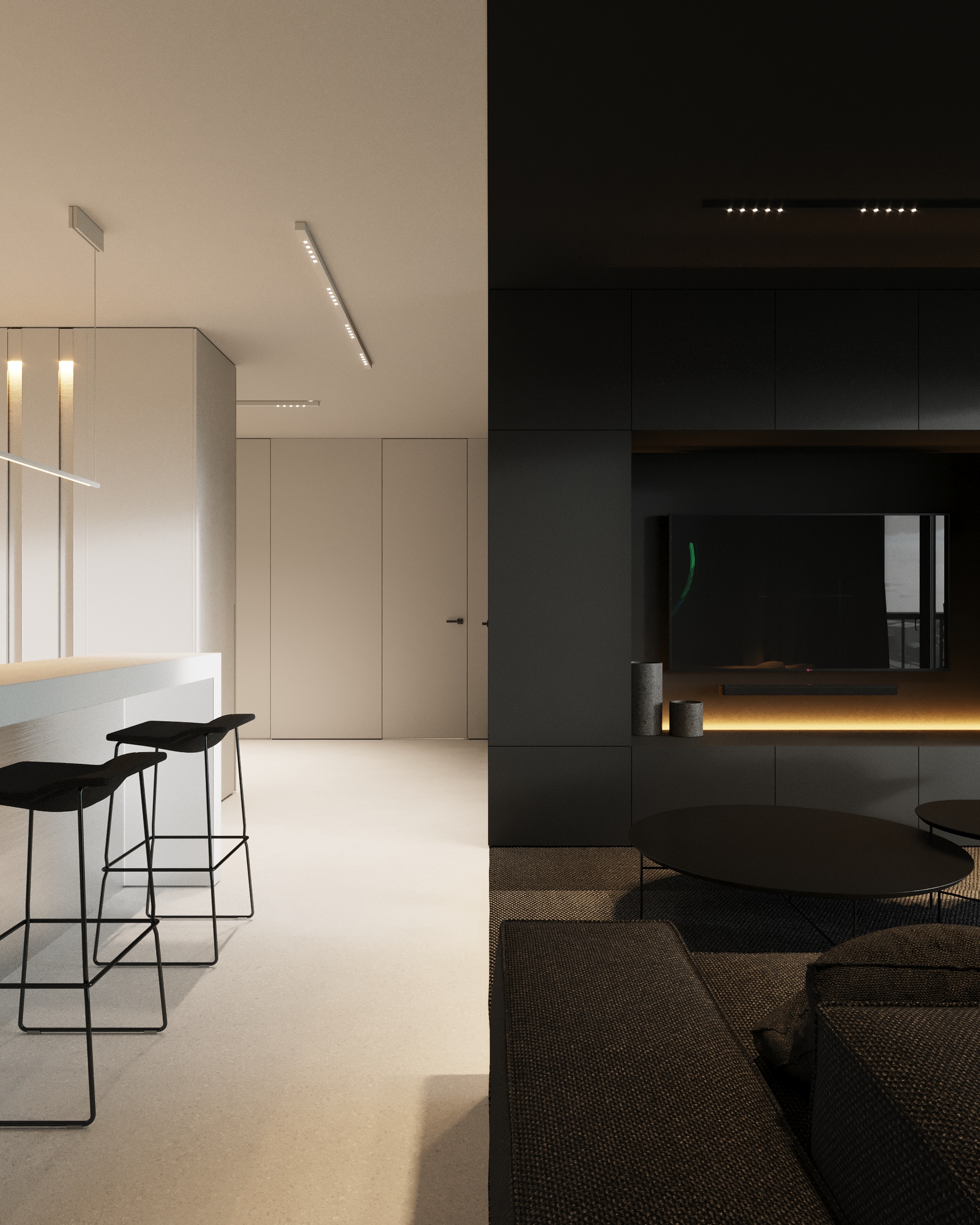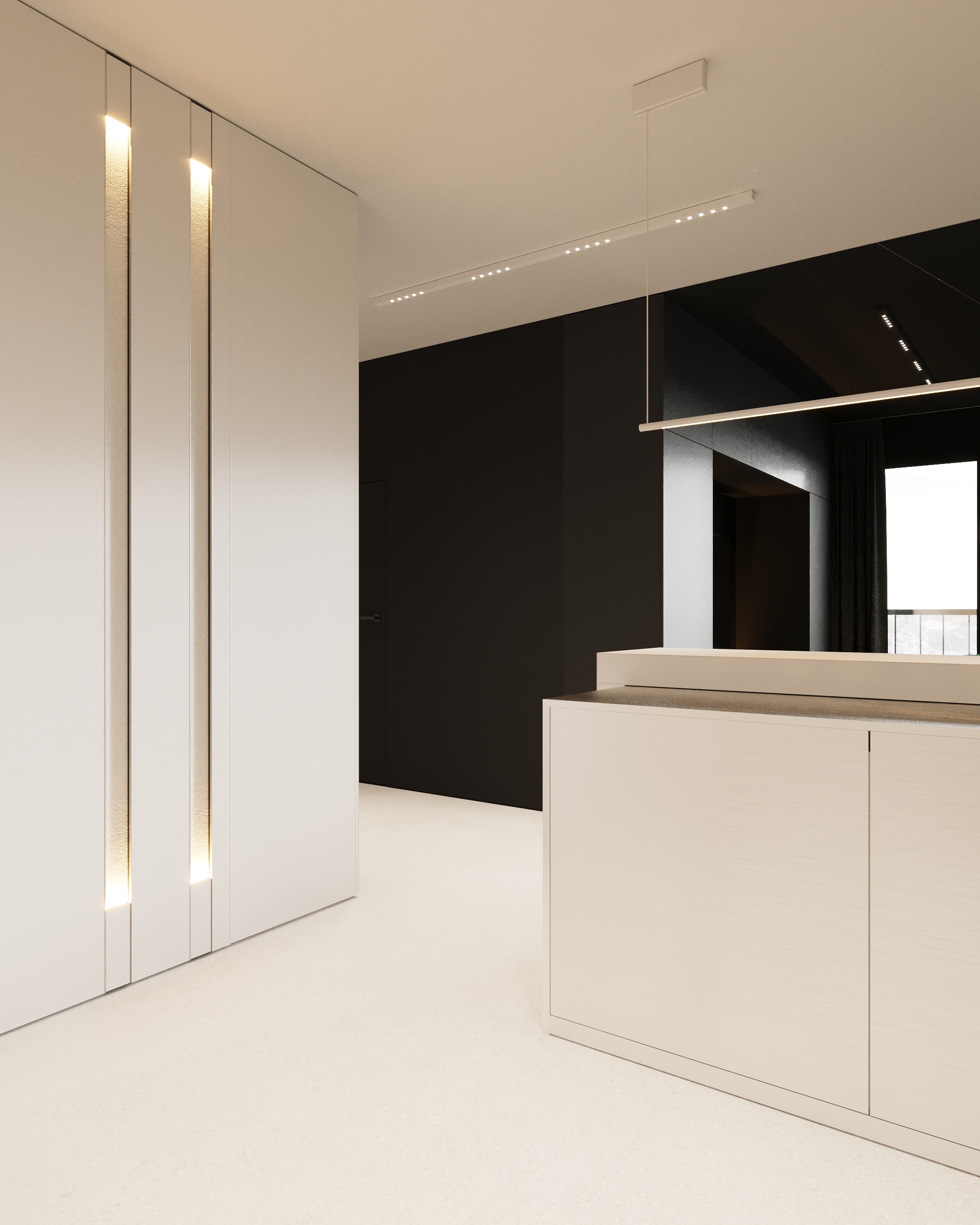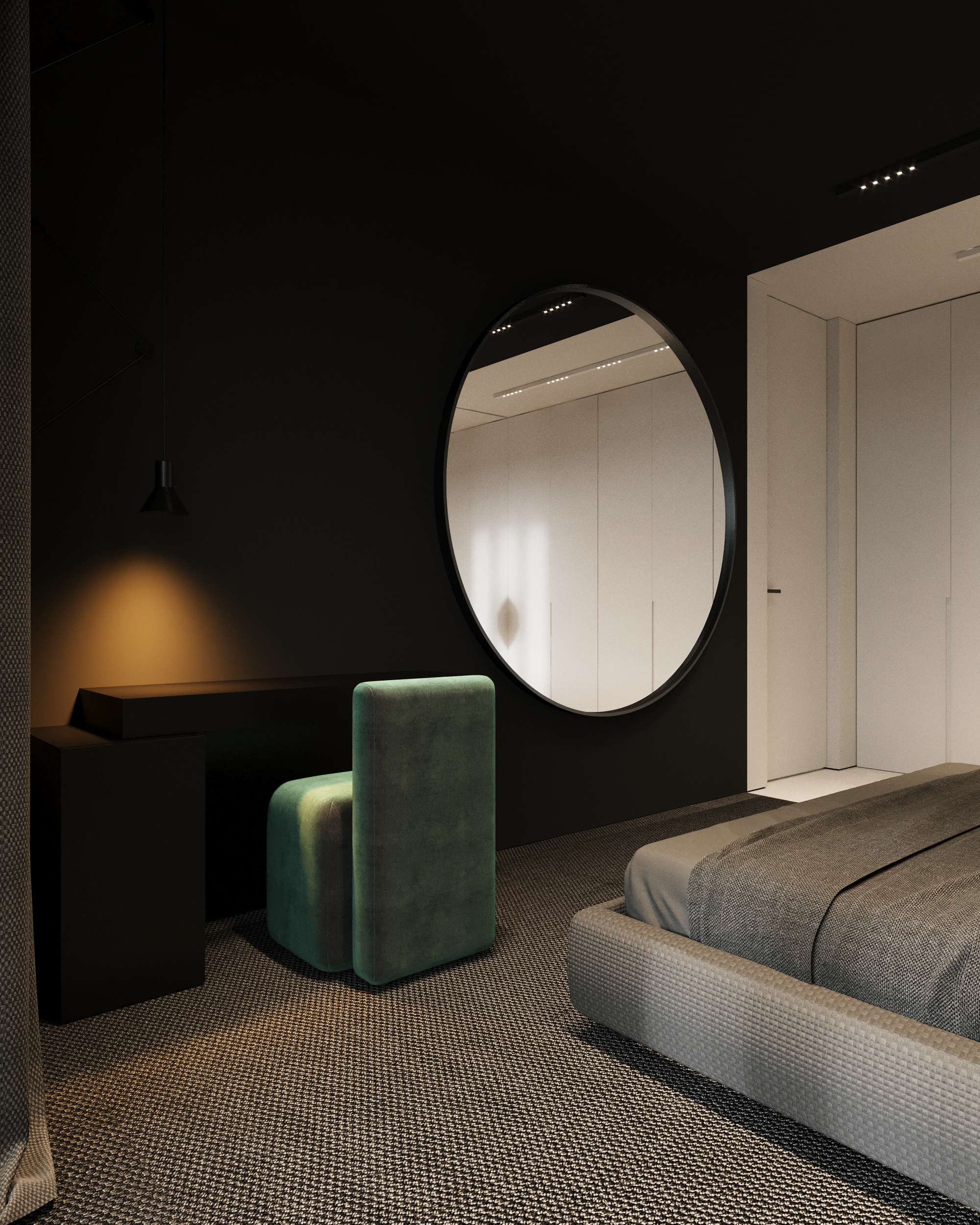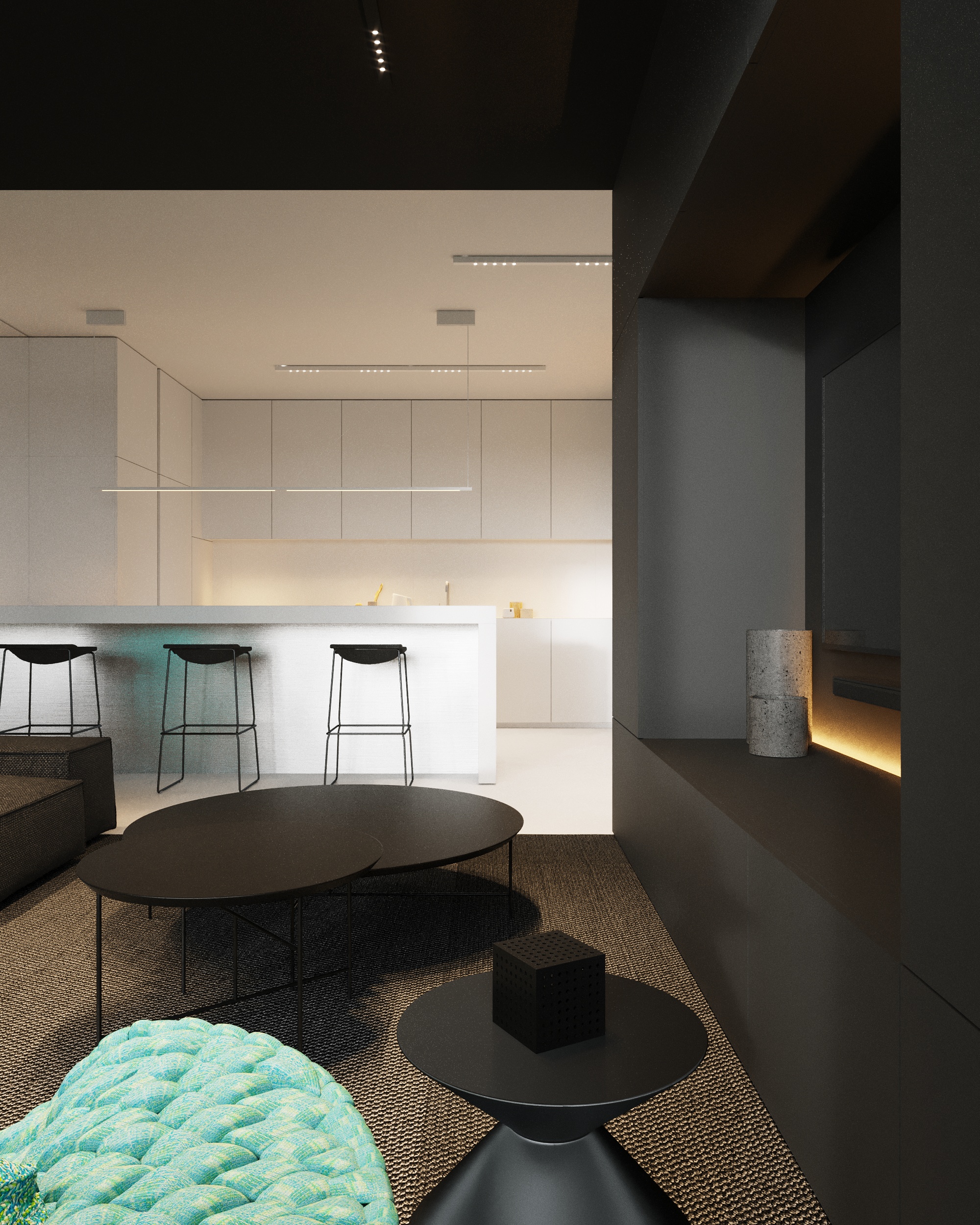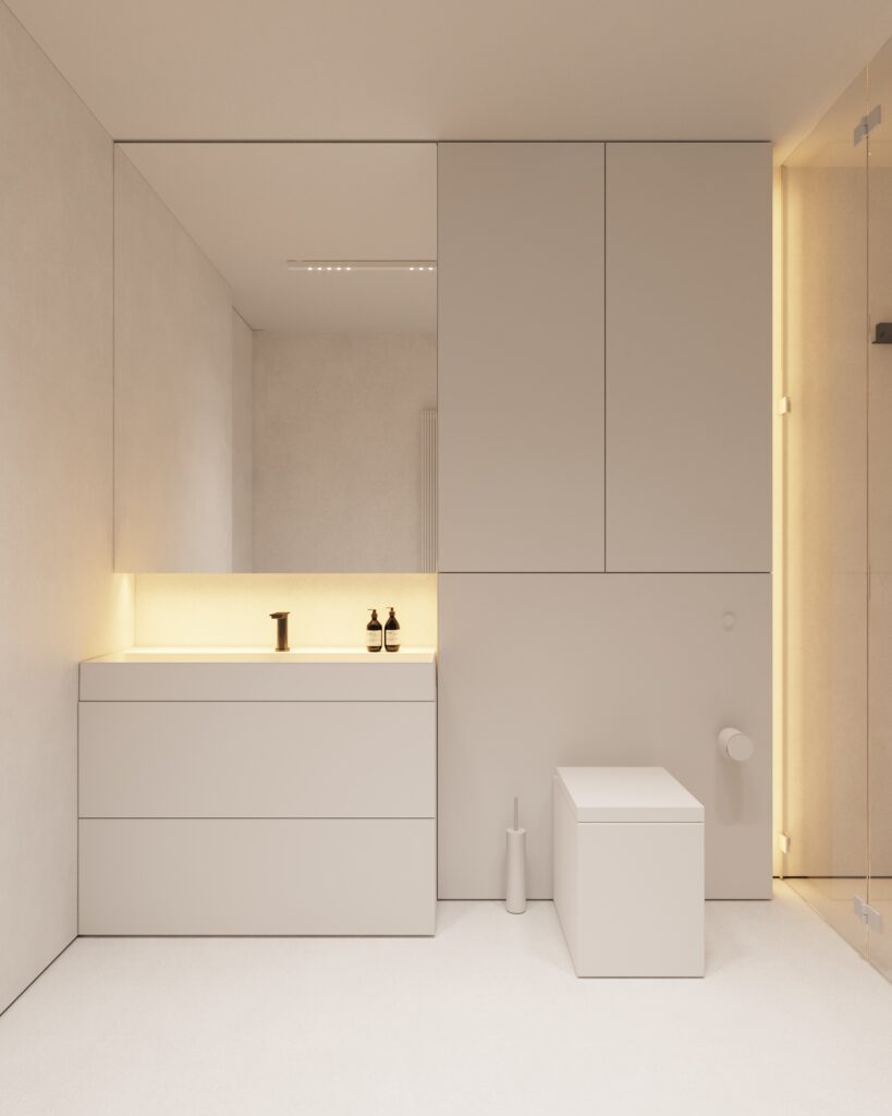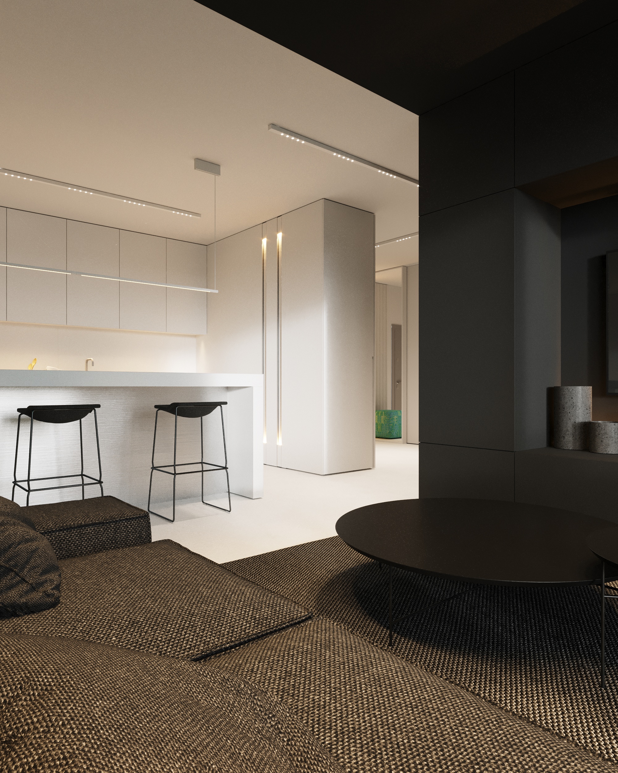 Projekt wnętrza oparty na geometrii, kontraście i świadomej redukcji. Biel i czerń stanowią tu główną oś kompozycyjną. czyste, zdecydowane, niekonkurujące ze sobą nawzajem ani z otoczeniem. Przestrzeń została zaprojektowana tak, by niczego nie udowadniać. Nie walczy kolorem, fakturą ani nadmiarem detalu. Jej siłą jest spokój wynikający z konsekwencji. Geometryczne kształty porządkują wnętrze i nadają mu charakter, a monochromatyczna paleta wprowadza ciszę wizualną. Zieleń, zazwyczaj kojarzona z uspokojeniem w tym projekcie pełni inną rolę. Jest akcentem. Elementem wyrazistym, który ożywia przestrzeń i przełamuje jej ascetyczny charakter. To wnętrze, w którym każdy kolor i linia mają swoje uzasadnienie. Spokojne, precyzyjne, świadome. Projekt, w którym forma nie dominuje tylko współistnieje z funkcją.