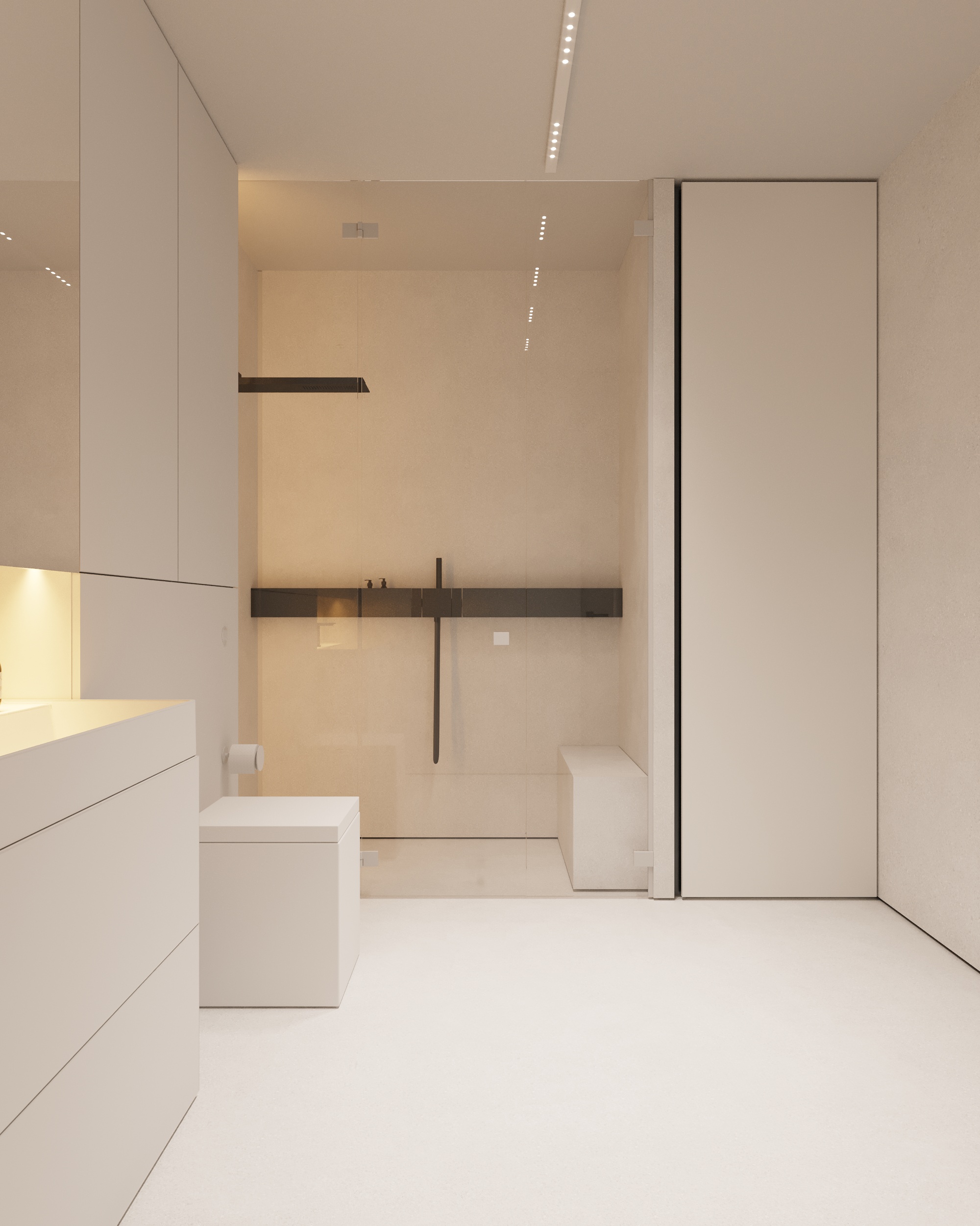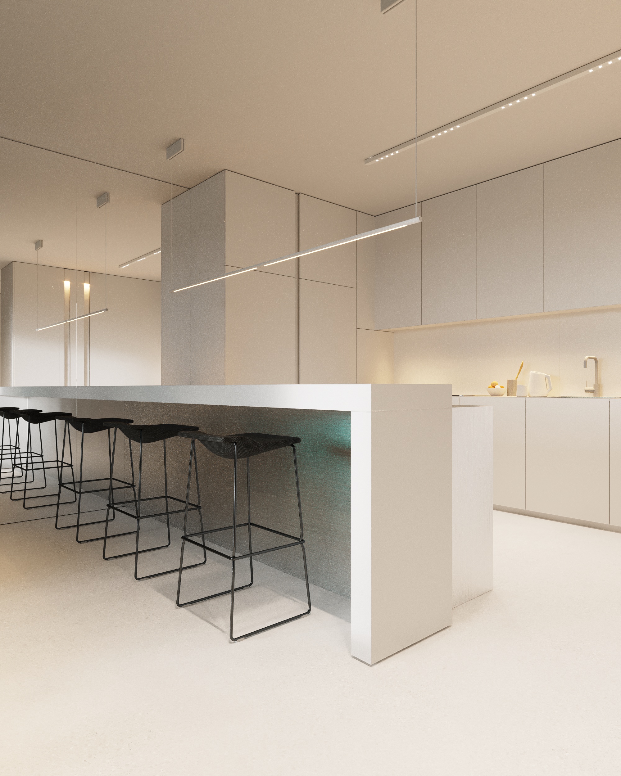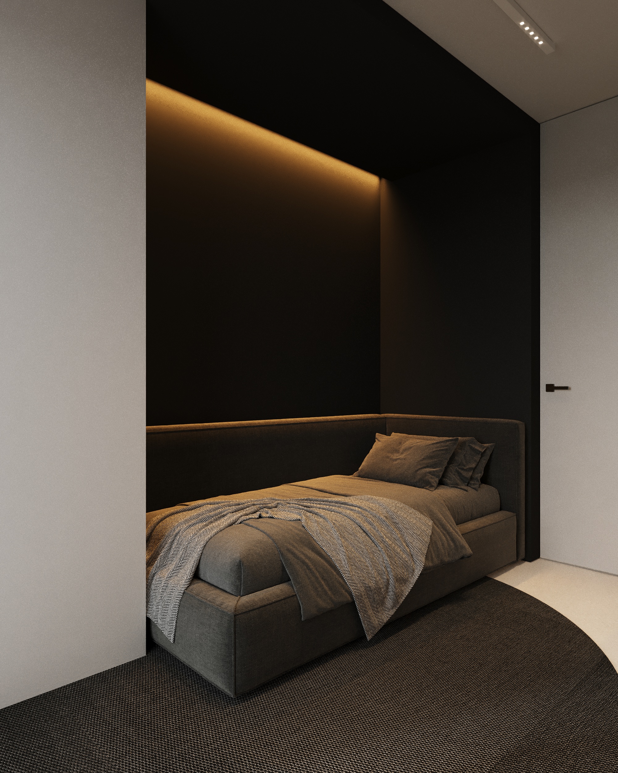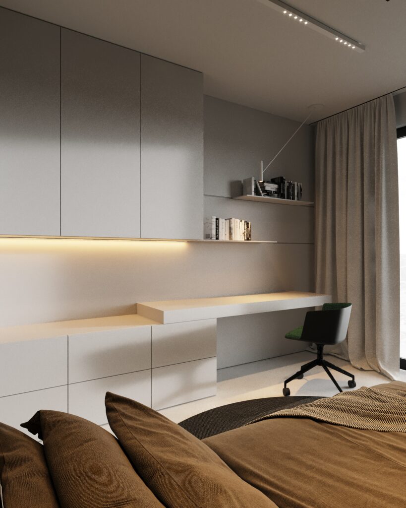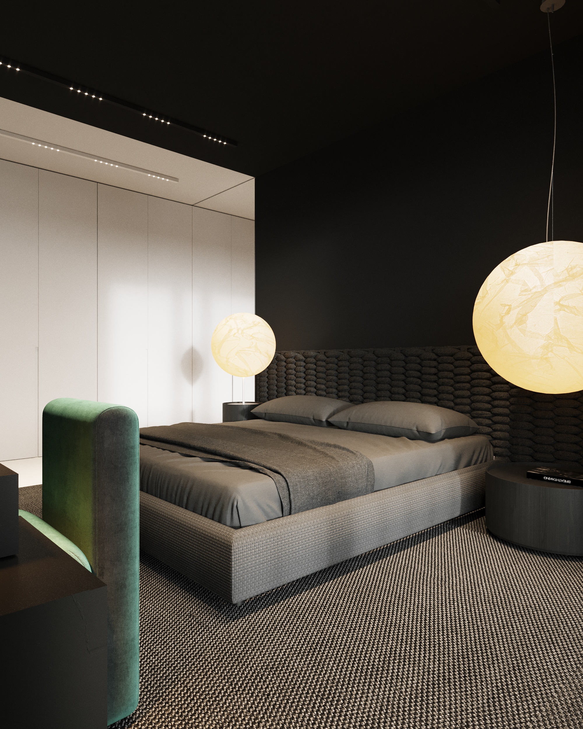 Projekt wnętrza oparty na geometrii, kontraście i świadomej redukcji. Biel i czerń stanowią tu główną oś kompozycyjną. czyste, zdecydowane, niekonkurujące ze sobą nawzajem ani z otoczeniem. Przestrzeń została zaprojektowana tak, by niczego nie udowadniać. Nie walczy kolorem, fakturą ani nadmiarem detalu. Jej siłą jest spokój wynikający z konsekwencji. Geometryczne kształty porządkują wnętrze i nadają mu charakter, a monochromatyczna paleta wprowadza ciszę wizualną. Zieleń, zazwyczaj kojarzona z uspokojeniem w tym projekcie pełni inną rolę. Jest akcentem. Elementem wyrazistym, który ożywia przestrzeń i przełamuje jej ascetyczny charakter. To wnętrze, w którym każdy kolor i linia mają swoje uzasadnienie. Spokojne, precyzyjne, świadome. Projekt, w którym forma nie dominuje tylko współistnieje z funkcją.