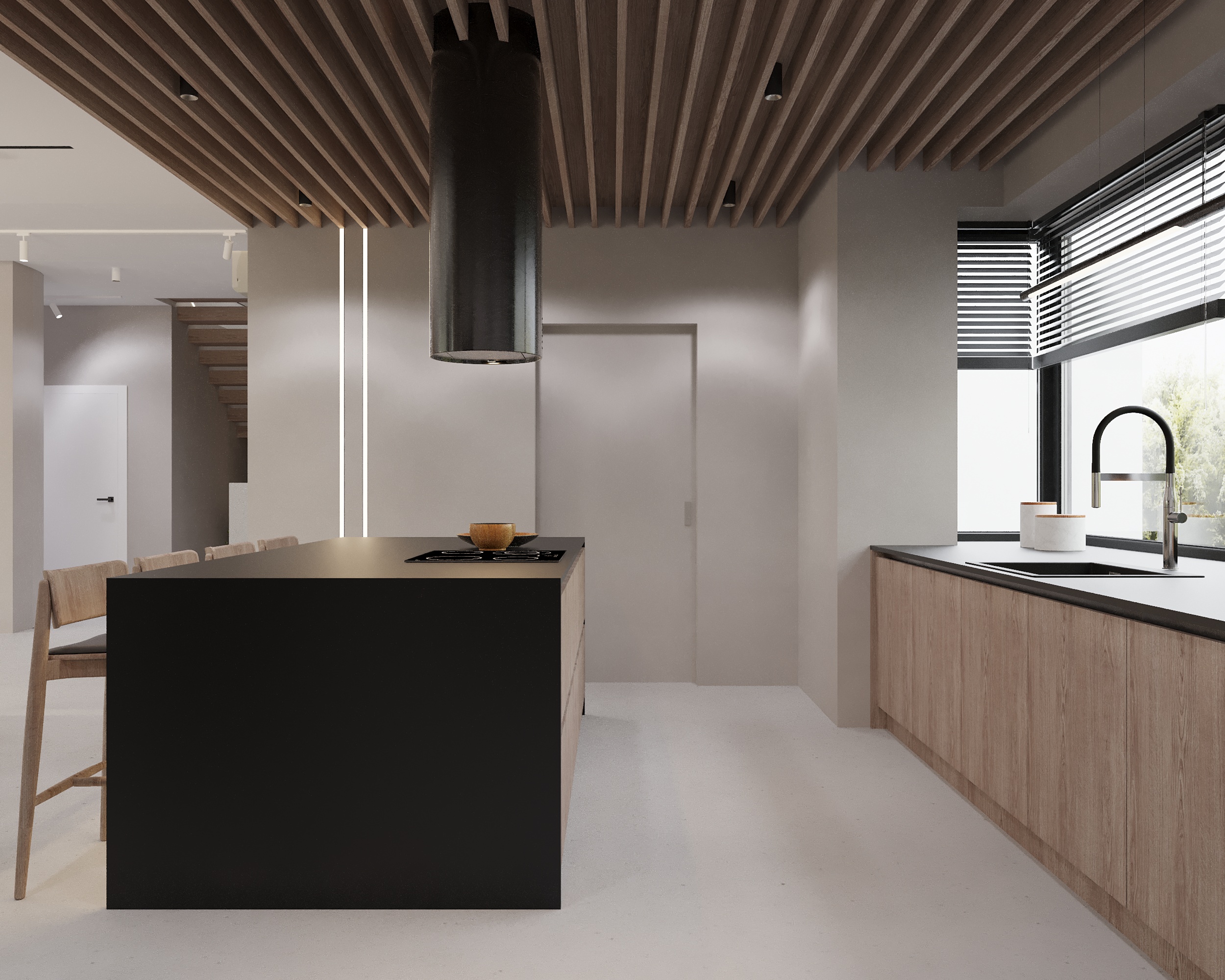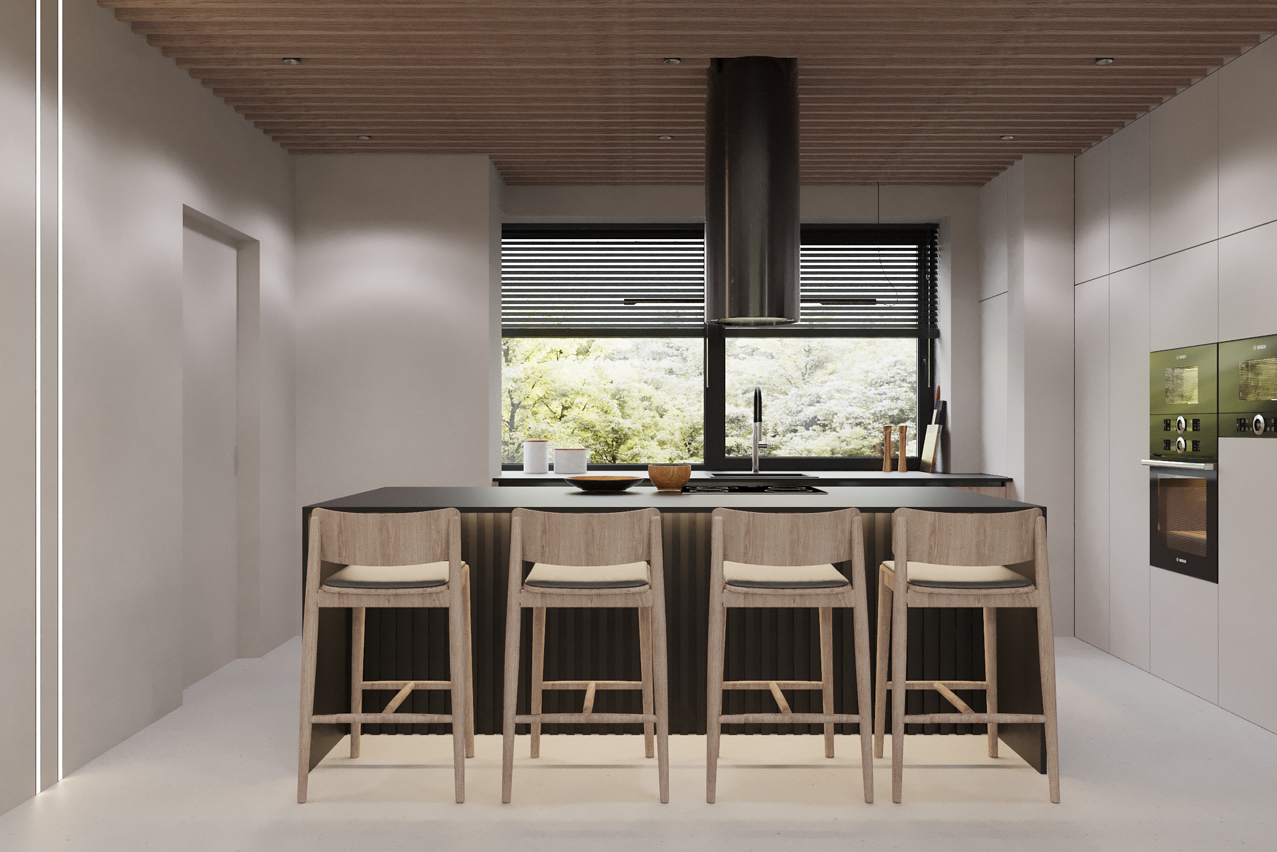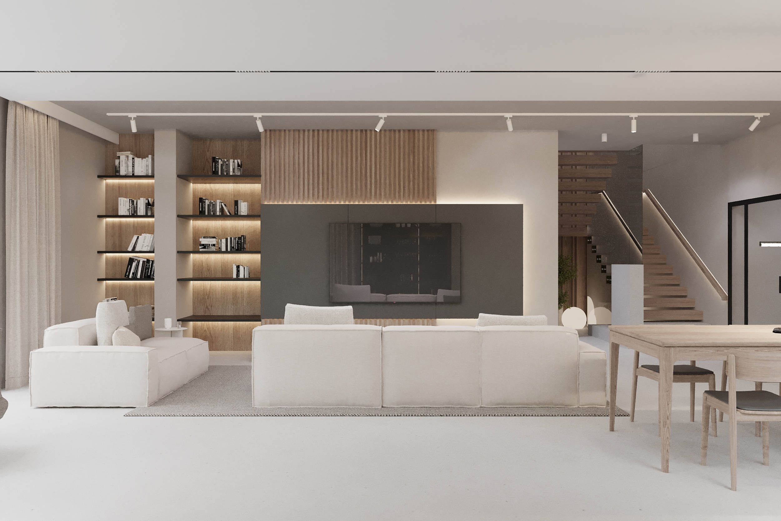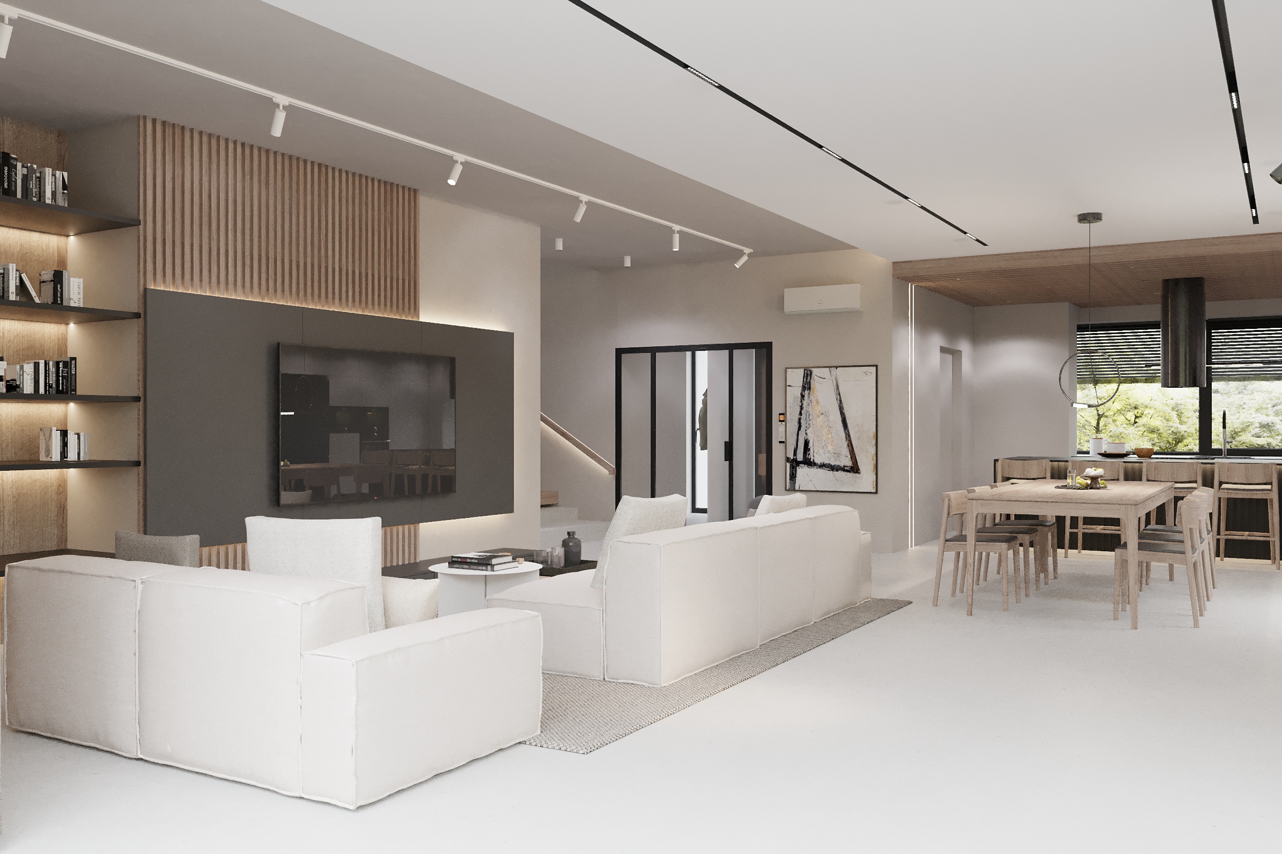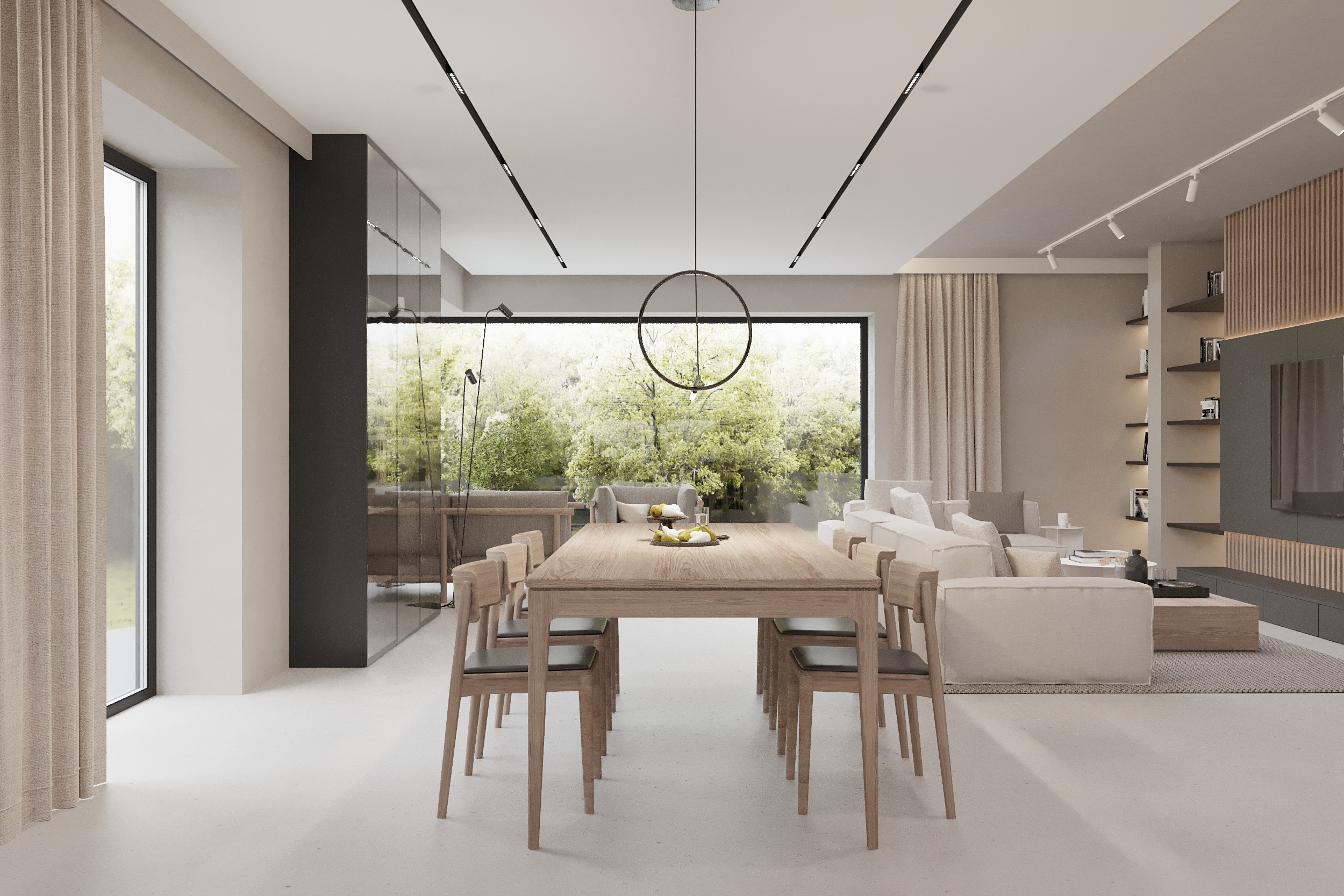 Wnętrze domu zachwyca swoją neutralnością oraz minimalizmem. Przestrzeń emanuje naturalnym urokiem i subtelnością, tworząc idealną atmosferę do życia. Dominują tu biel, beż oraz drewno o zgaszonym odcieniu. Jasne kolory, które odbijają światło, nadają pomieszczeniu przestronność. Przełamaniem są czarne meble i elementy wyposażenia, które stanowią równowagę dla jasnobeżowej bazy. Użyte tkaniny w projekcie pokazują fakturę i podkreślają miękkość obić. Proste oraz minimalistyczne linie mebli łączą się z funkcjonalnością i podkreślają elegancję całego wnętrza. Wnętrze emanuje ciepłem i spokojem, tworząc idealną harmonię i wyważoną przestrzeń do życia.