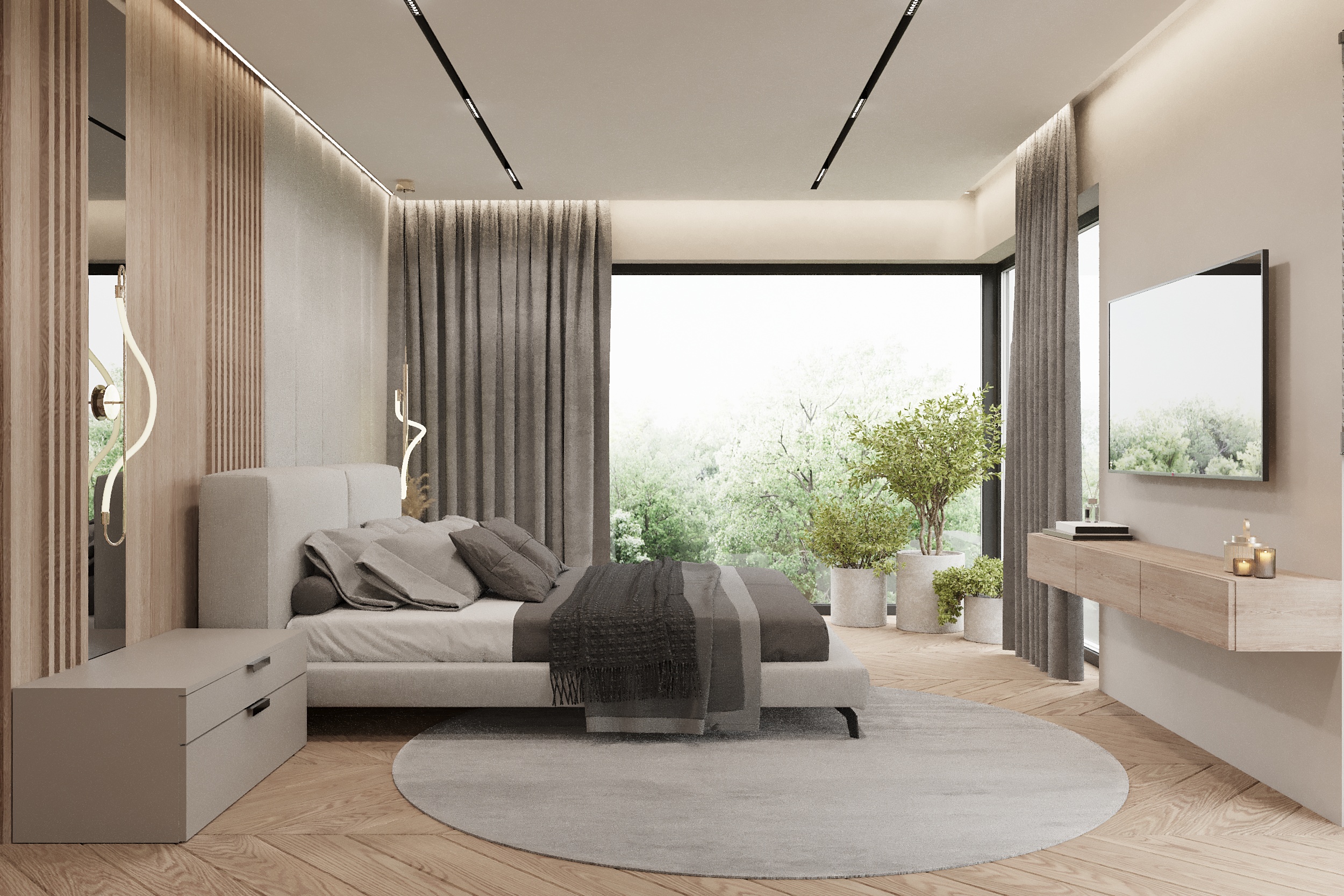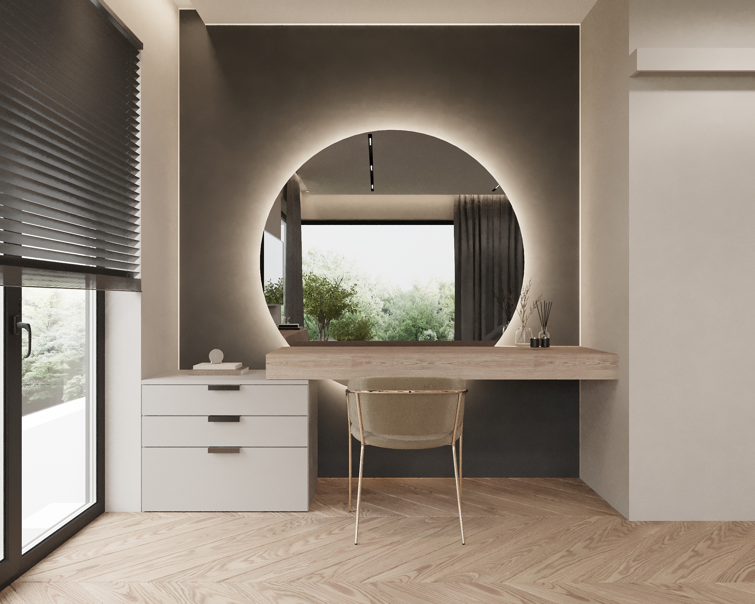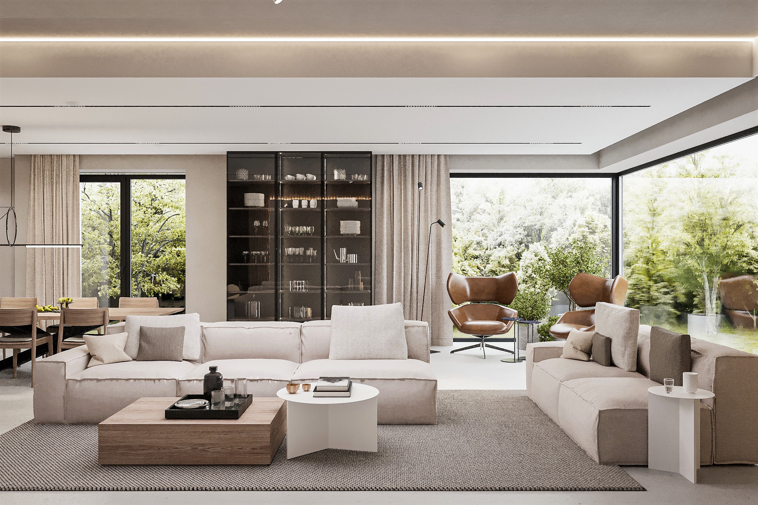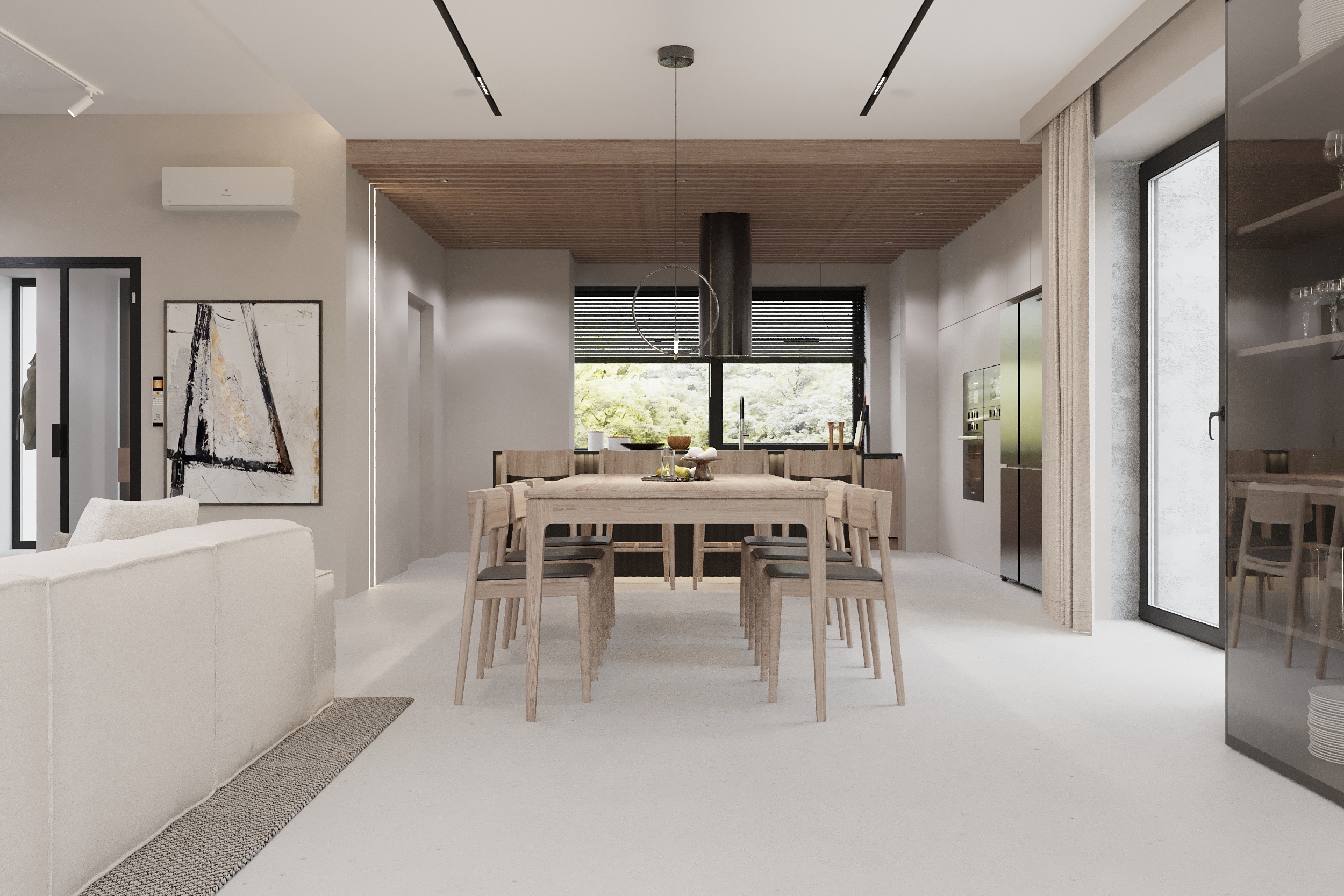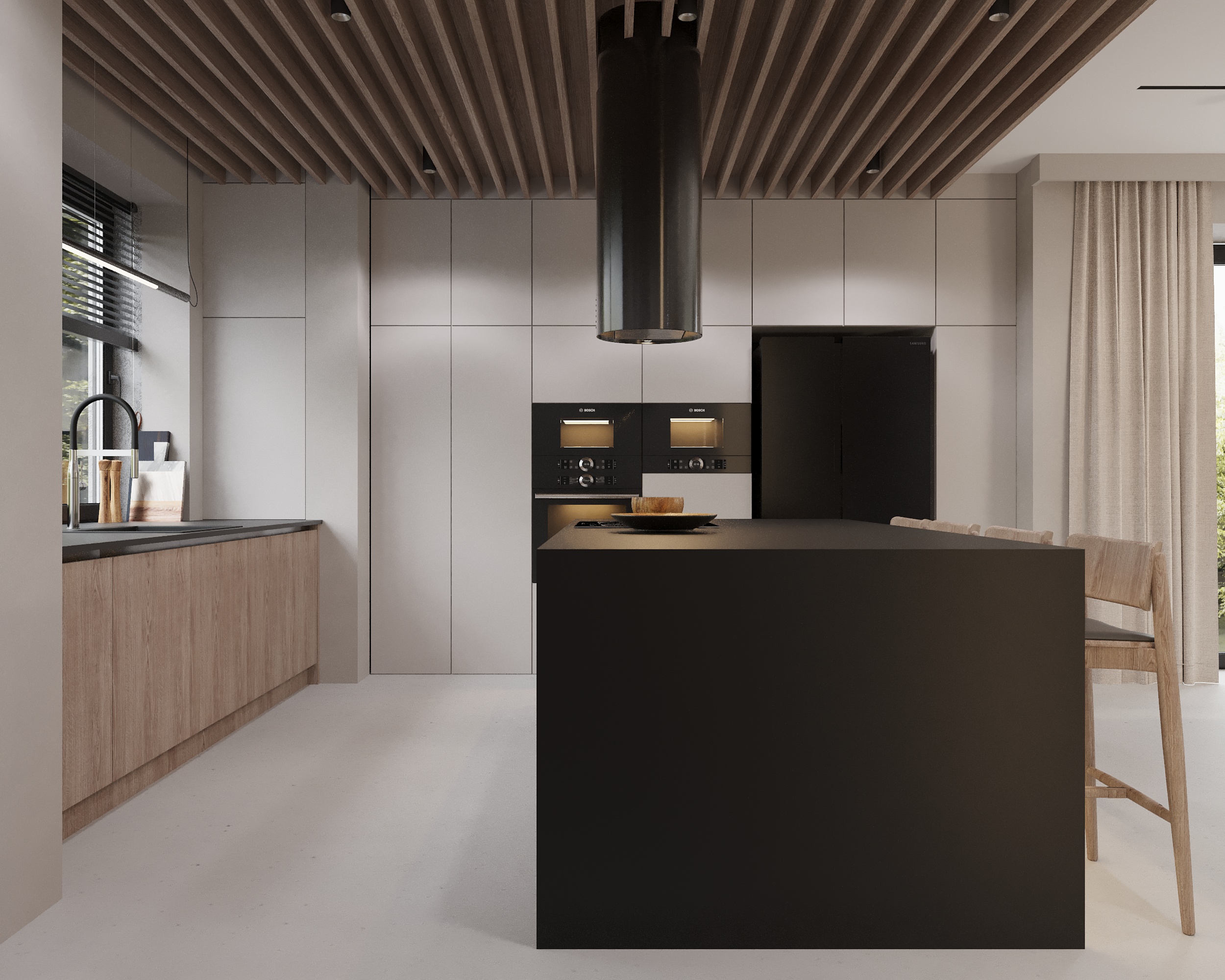 Wnętrze domu zachwyca swoją neutralnością oraz minimalizmem. Przestrzeń emanuje naturalnym urokiem i subtelnością, tworząc idealną atmosferę do życia. Dominują tu biel, beż oraz drewno o zgaszonym odcieniu. Jasne kolory, które odbijają światło, nadają pomieszczeniu przestronność. Przełamaniem są czarne meble i elementy wyposażenia, które stanowią równowagę dla jasnobeżowej bazy. Użyte tkaniny w projekcie pokazują fakturę i podkreślają miękkość obić. Proste oraz minimalistyczne linie mebli łączą się z funkcjonalnością i podkreślają elegancję całego wnętrza. Wnętrze emanuje ciepłem i spokojem, tworząc idealną harmonię i wyważoną przestrzeń do życia.