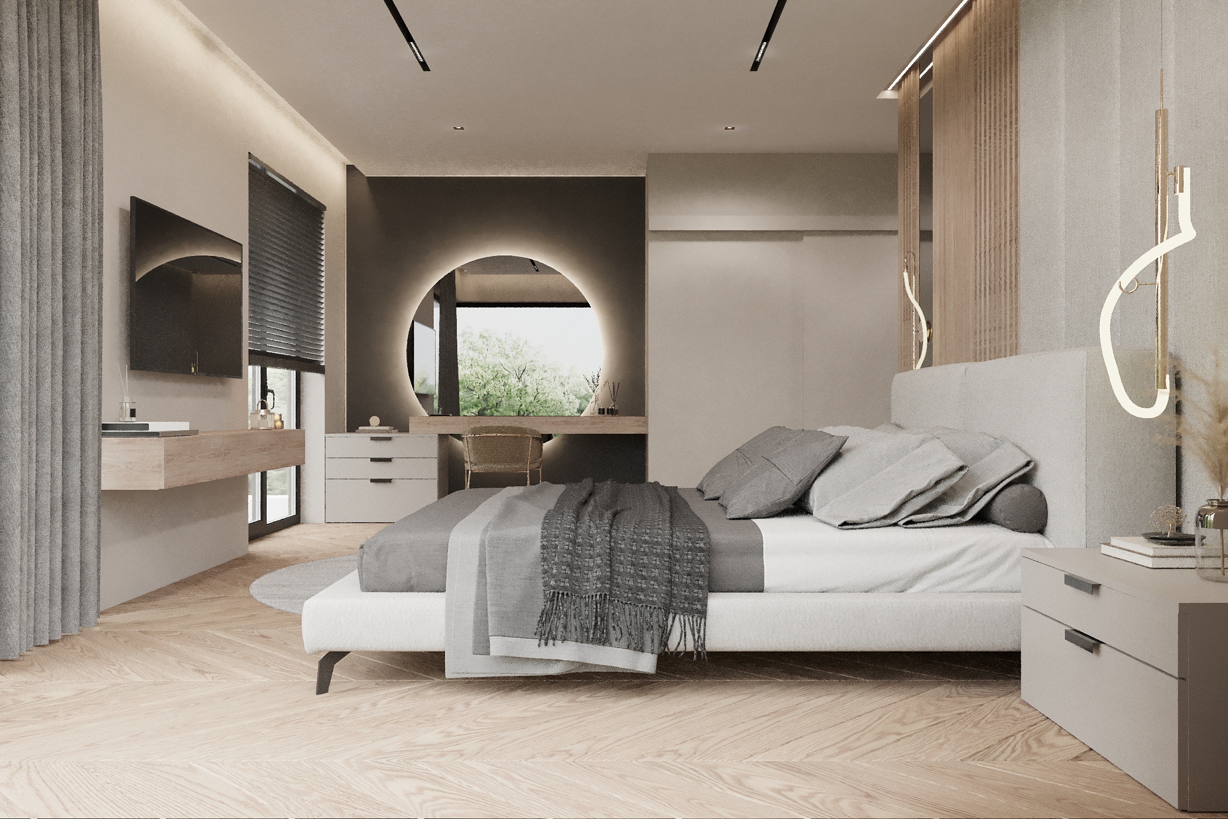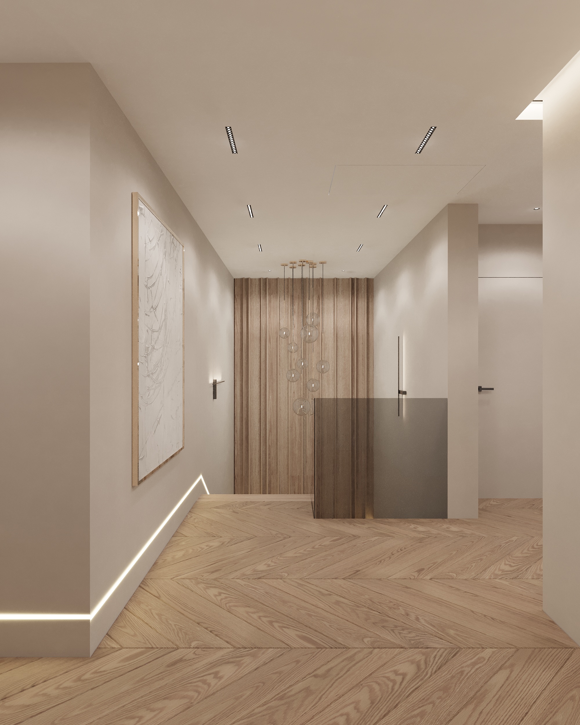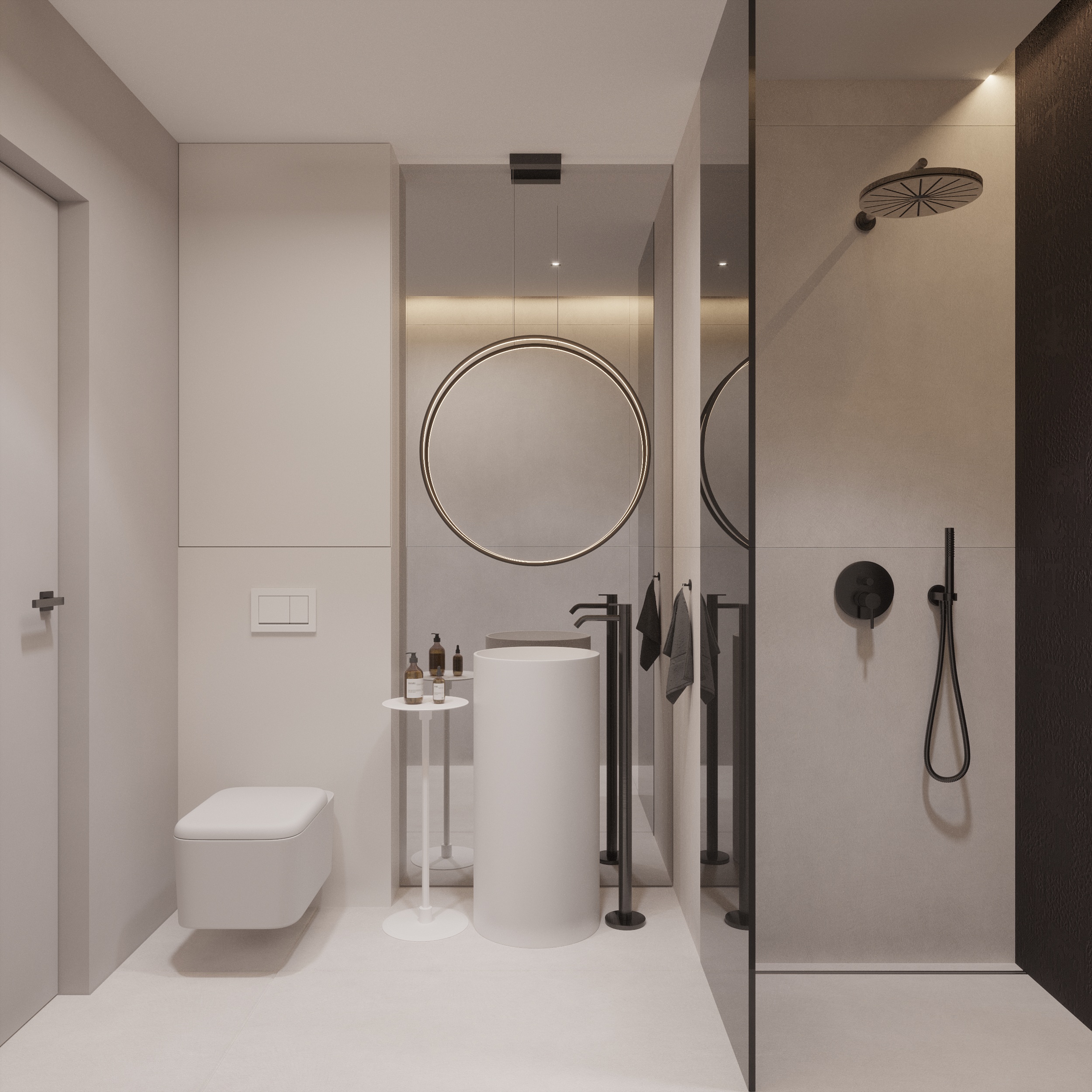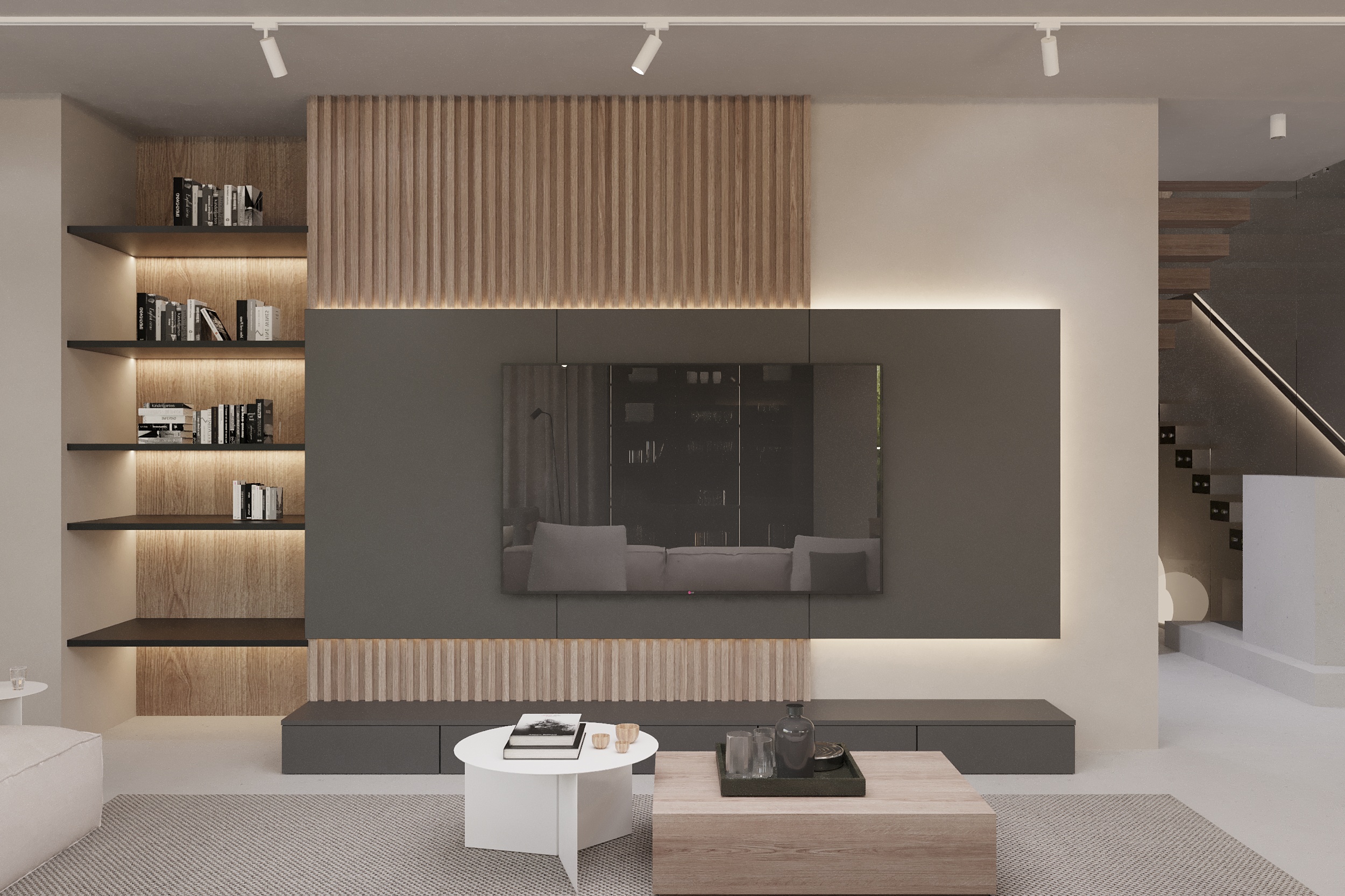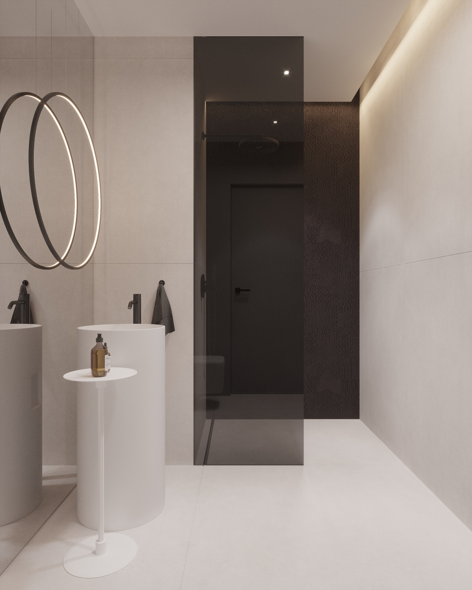 Wnętrze domu zachwyca swoją neutralnością oraz minimalizmem. Przestrzeń emanuje naturalnym urokiem i subtelnością, tworząc idealną atmosferę do życia. Dominują tu biel, beż oraz drewno o zgaszonym odcieniu. Jasne kolory, które odbijają światło, nadają pomieszczeniu przestronność. Przełamaniem są czarne meble i elementy wyposażenia, które stanowią równowagę dla jasnobeżowej bazy. Użyte tkaniny w projekcie pokazują fakturę i podkreślają miękkość obić. Proste oraz minimalistyczne linie mebli łączą się z funkcjonalnością i podkreślają elegancję całego wnętrza. Wnętrze emanuje ciepłem i spokojem, tworząc idealną harmonię i wyważoną przestrzeń do życia.