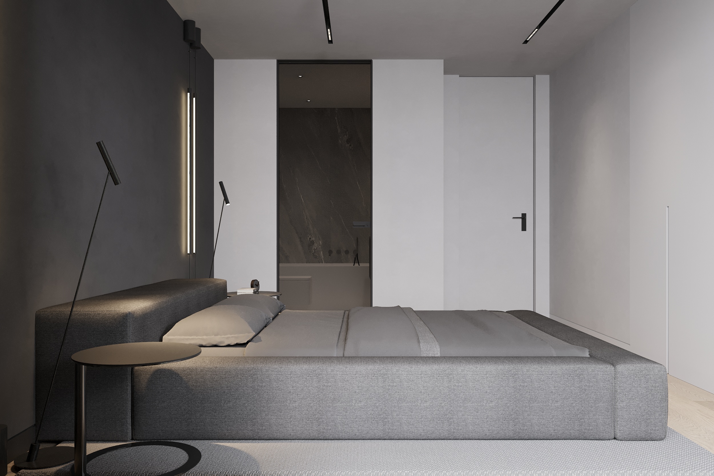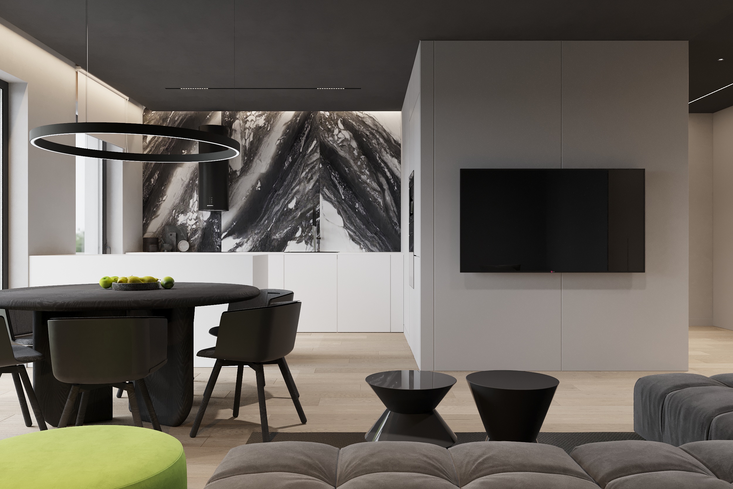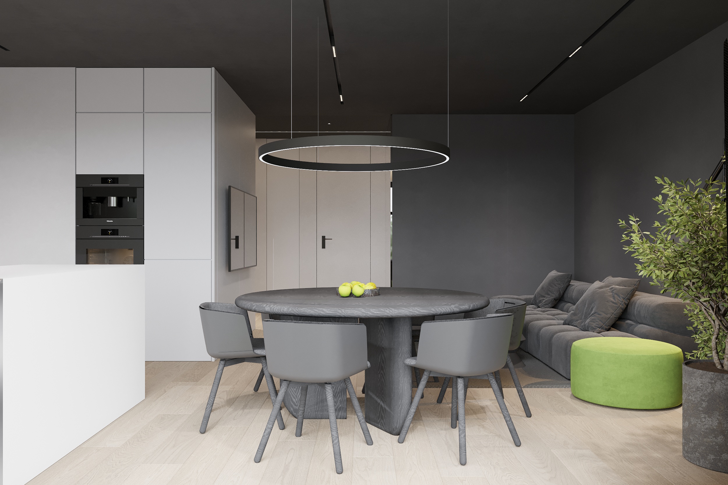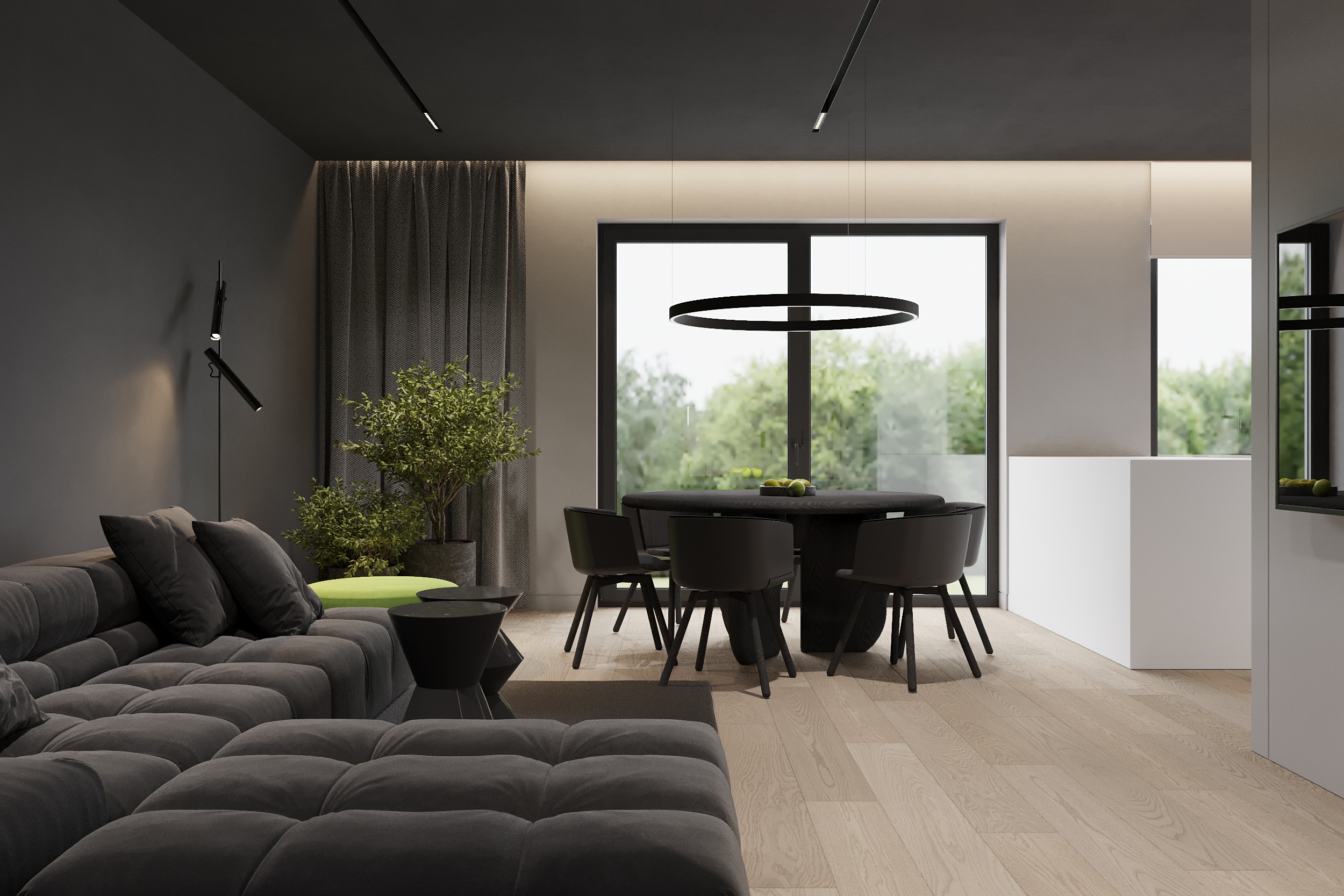 W tym projekcie zdecydowanie dominują czerń, biel i szarość. Zielony akcent pufy w salonie przełamuje przewodnie kolory. Głównym założeniem projektu było zróżnicowanie kolorów, tekstur i form. Biel łączy się z czernią, ostre i proste formy współgrają z obłymi i kolistymi kształtami, a welurowe, miękkie materiały stanowią kontrast dla mocnych tkanin z widocznym splotem. Oświetlenie ogólne oraz dekoracyjne zostało zaprojektowane tak, aby było subtelne, niewidoczne, ale jednocześnie funkcjonalne. Eleganckie wnętrze w ciemnej kolorystyce tworzy spójną i wyrafinowaną całość.