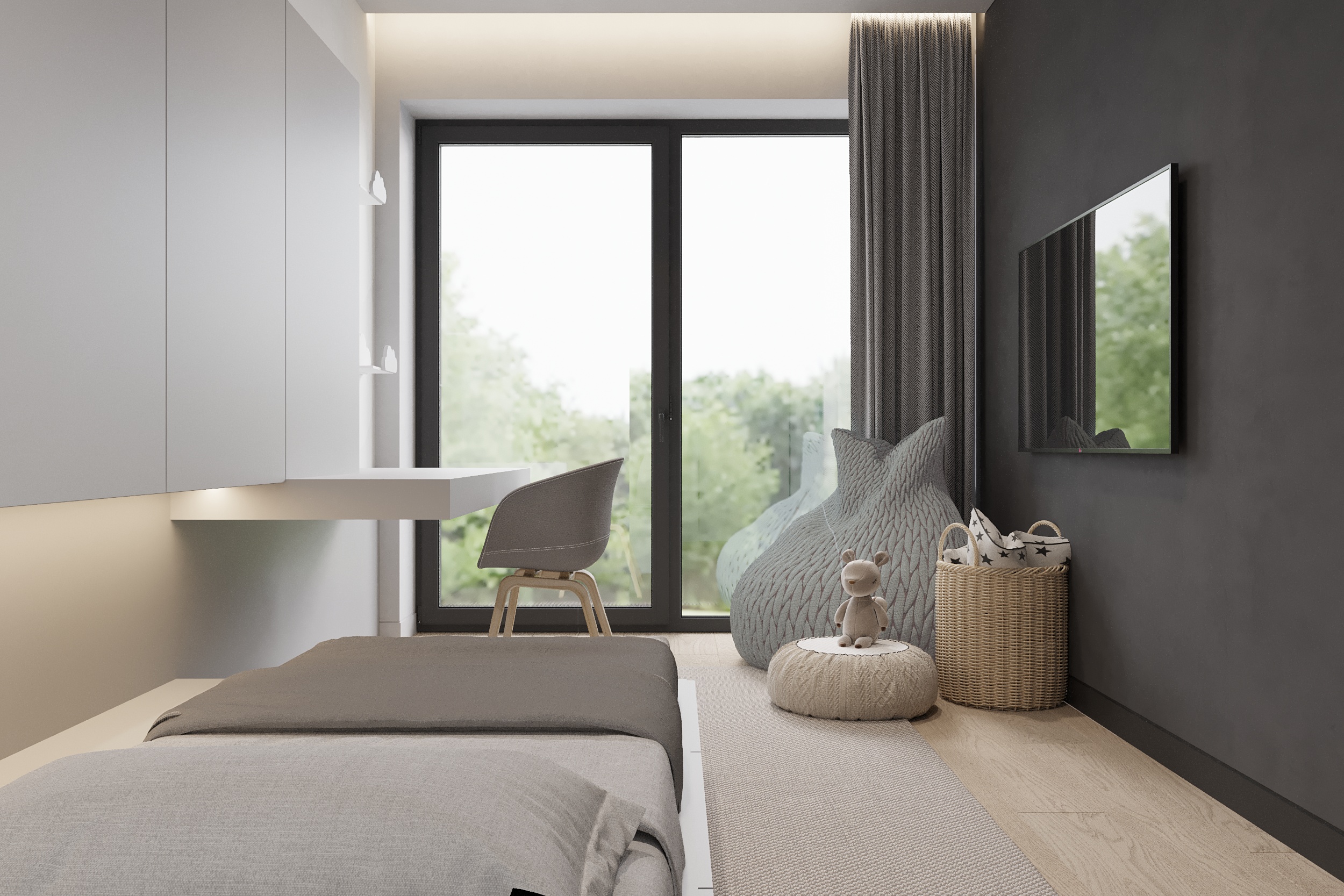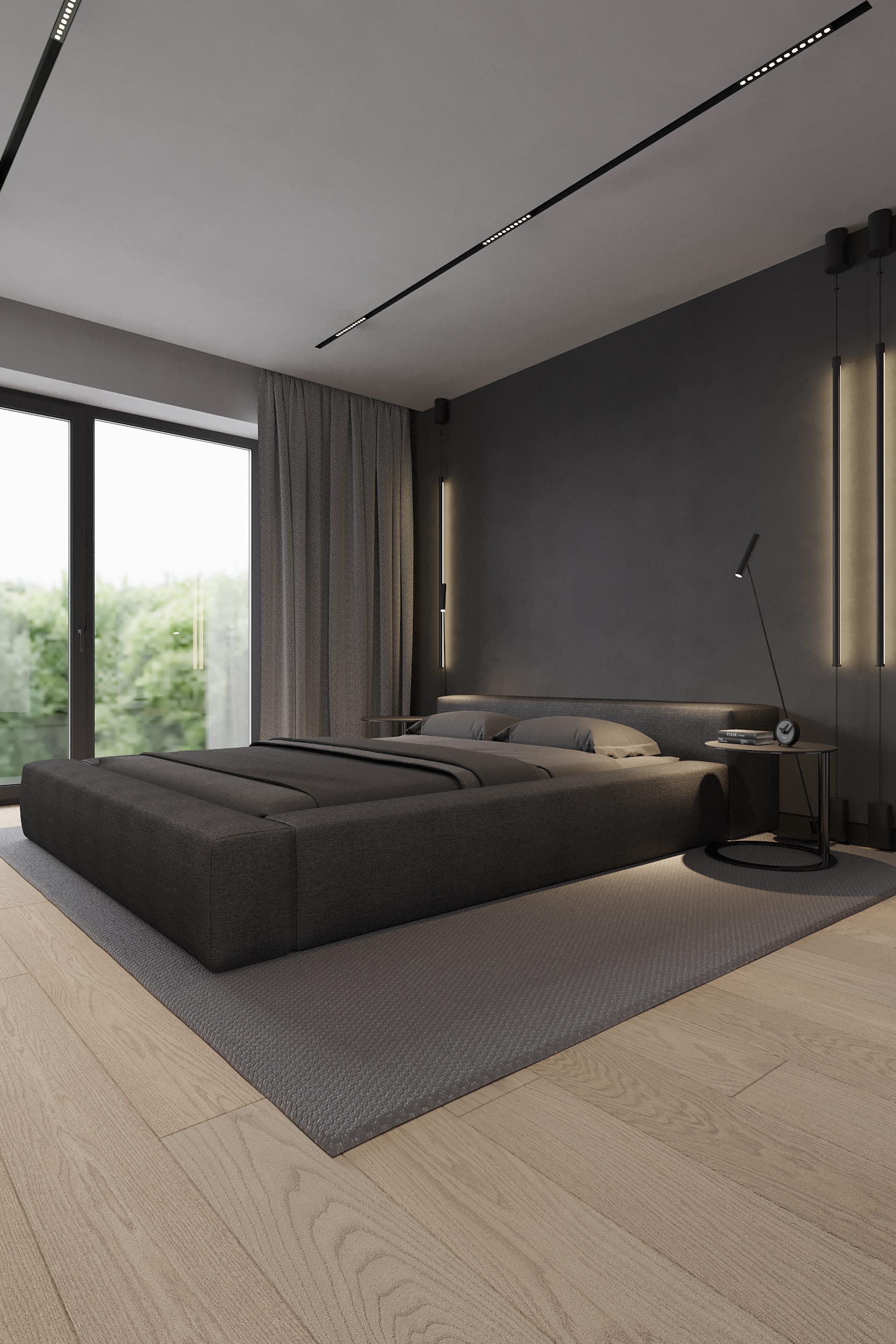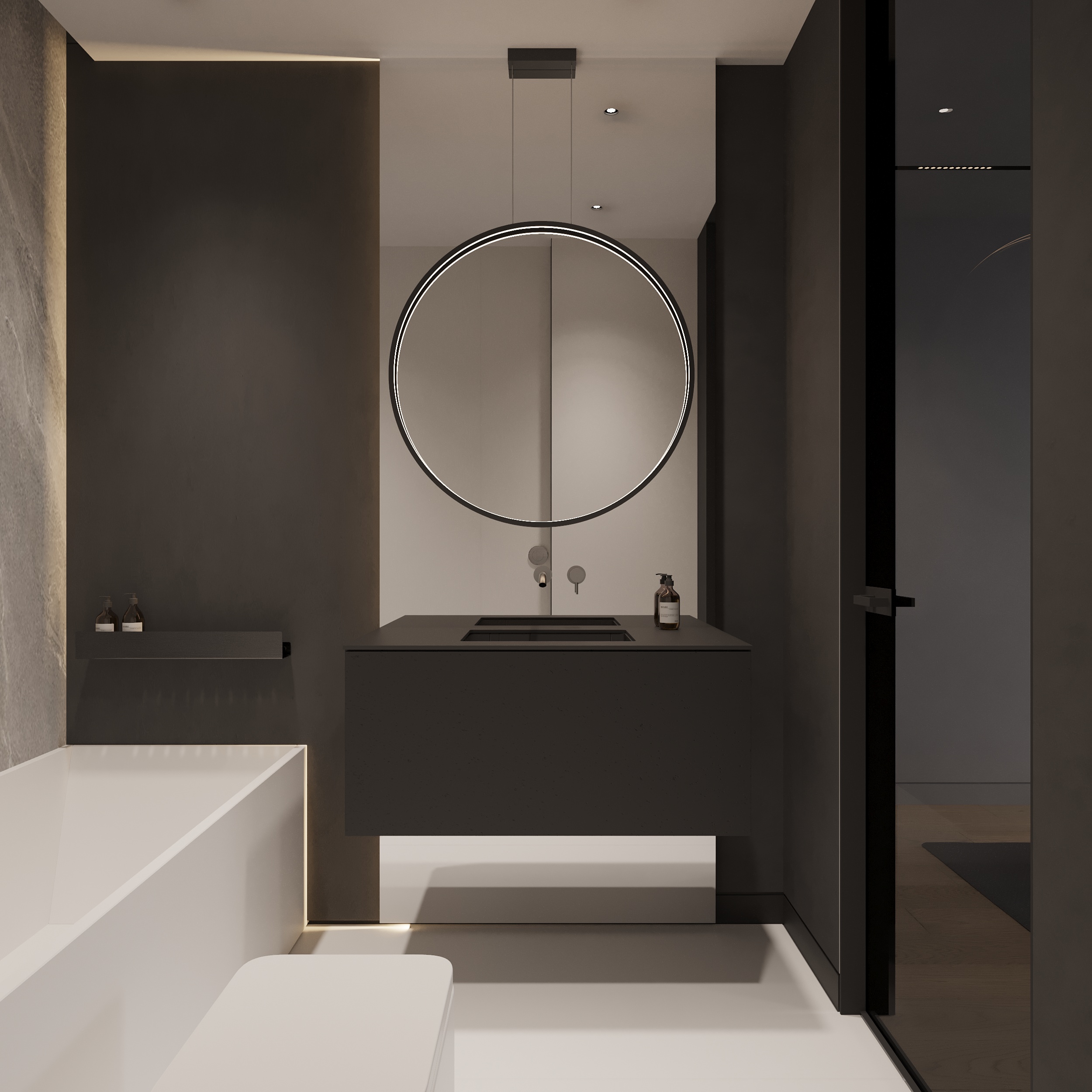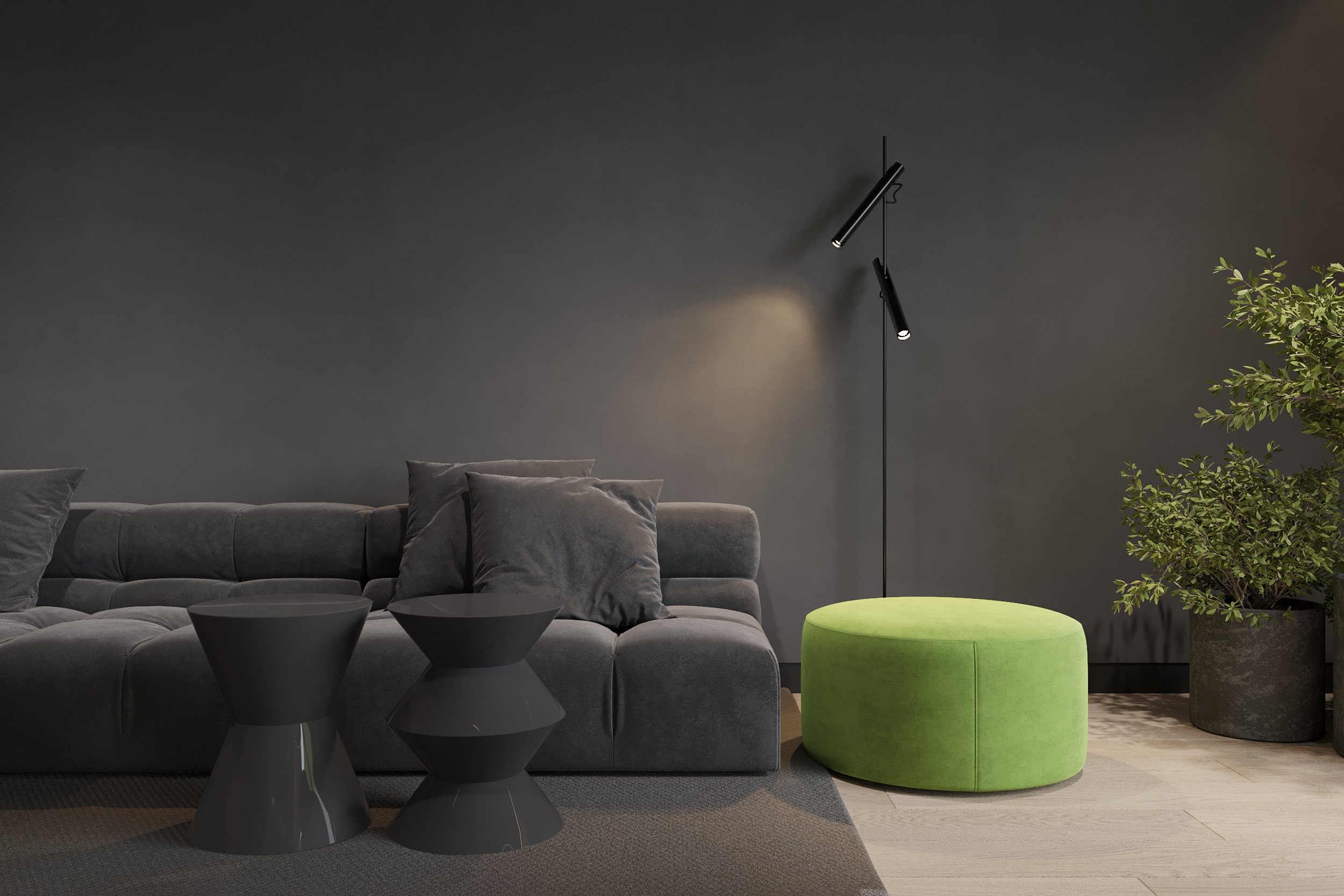 W tym projekcie zdecydowanie dominują czerń, biel i szarość. Zielony akcent pufy w salonie przełamuje przewodnie kolory. Głównym założeniem projektu było zróżnicowanie kolorów, tekstur i form. Biel łączy się z czernią, ostre i proste formy współgrają z obłymi i kolistymi kształtami, a welurowe, miękkie materiały stanowią kontrast dla mocnych tkanin z widocznym splotem. Oświetlenie ogólne oraz dekoracyjne zostało zaprojektowane tak, aby było subtelne, niewidoczne, ale jednocześnie funkcjonalne. Eleganckie wnętrze w ciemnej kolorystyce tworzy spójną i wyrafinowaną całość.