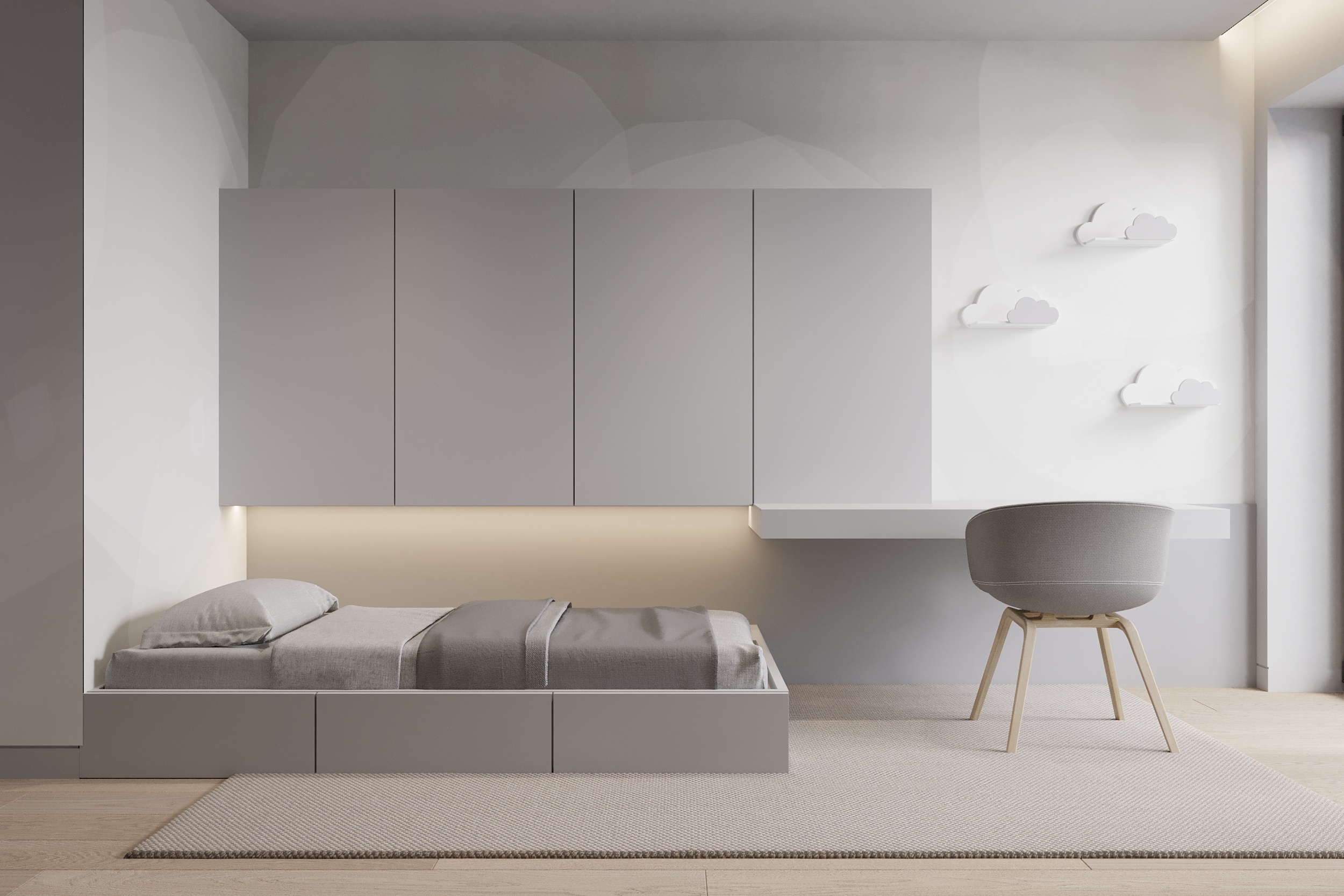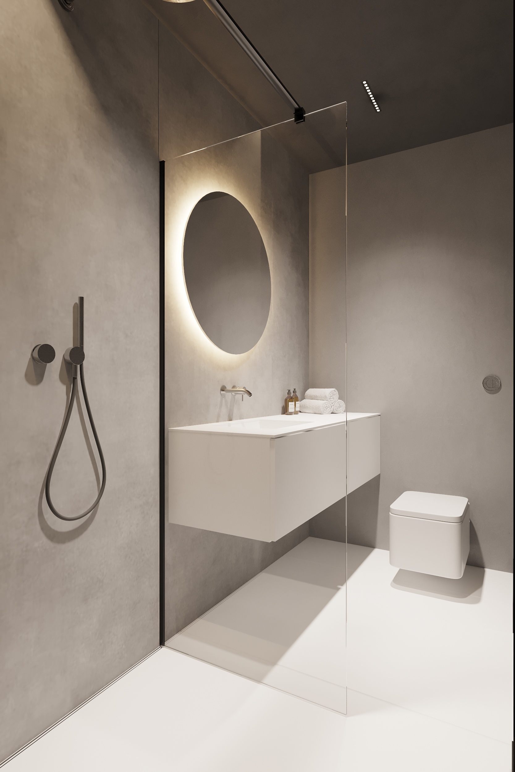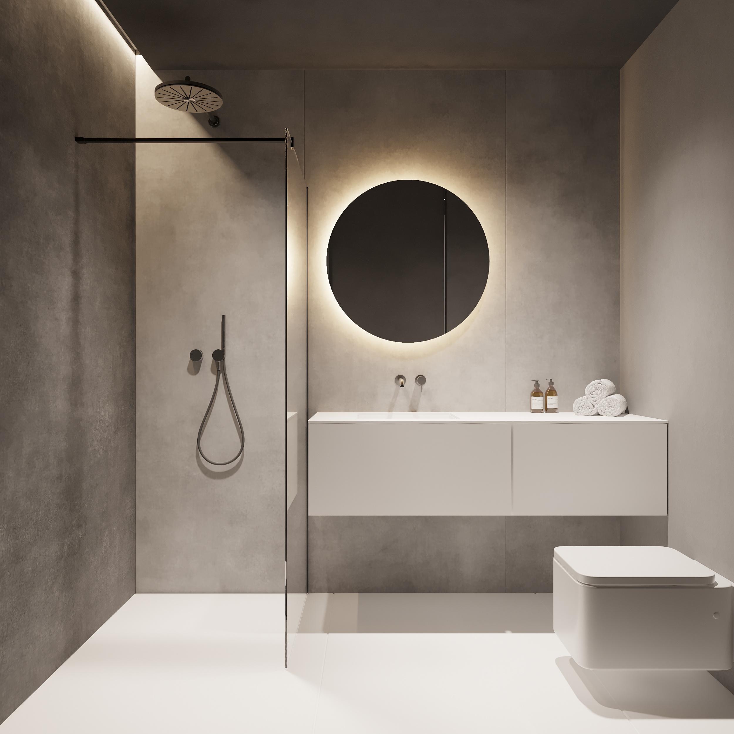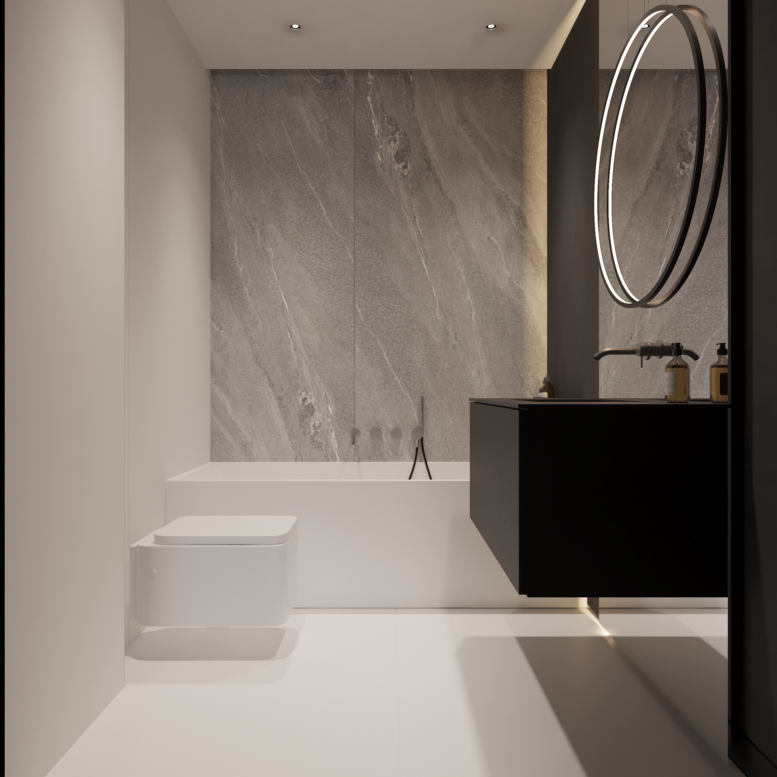 W tym projekcie zdecydowanie dominują czerń, biel i szarość. Zielony akcent pufy w salonie przełamuje przewodnie kolory. Głównym założeniem projektu było zróżnicowanie kolorów, tekstur i form. Biel łączy się z czernią, ostre i proste formy współgrają z obłymi i kolistymi kształtami, a welurowe, miękkie materiały stanowią kontrast dla mocnych tkanin z widocznym splotem. Oświetlenie ogólne oraz dekoracyjne zostało zaprojektowane tak, aby było subtelne, niewidoczne, ale jednocześnie funkcjonalne. Eleganckie wnętrze w ciemnej kolorystyce tworzy spójną i wyrafinowaną całość.